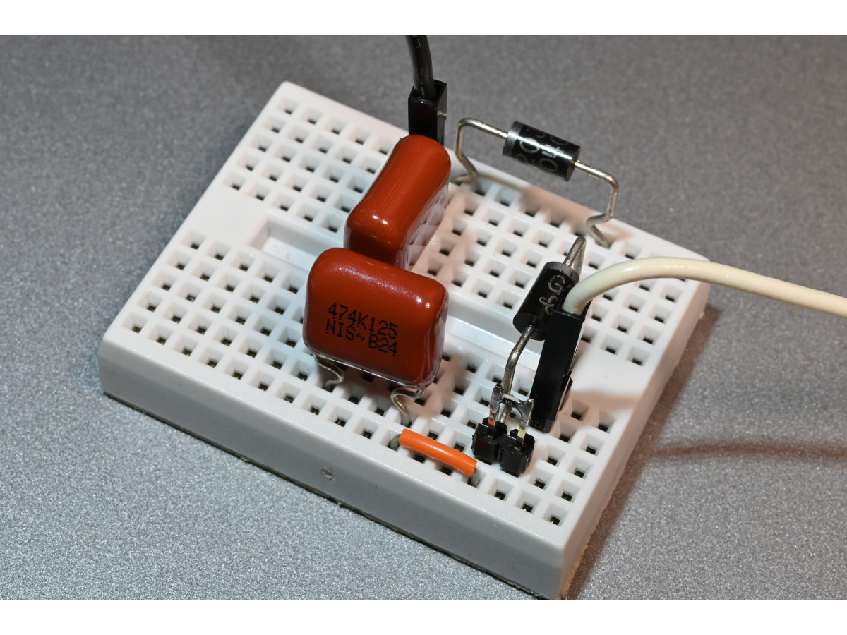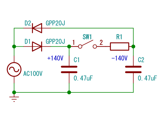 ダイオード D1、D2 には逆耐圧が 288V 以上あるものを使う必要があります。GPP20J は逆耐圧が 600V あります。小信号ダイオードは逆耐圧が低いので使えません。コンデンサ C1、C2 の耐圧は 144V 以上必要です。