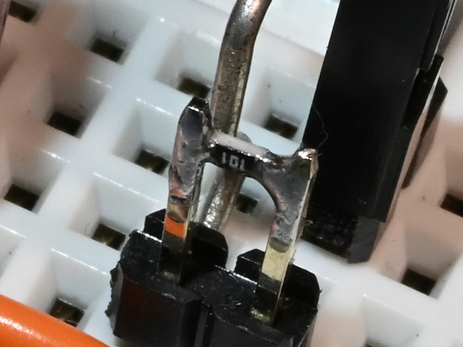 ピンヘッダにチップ抵抗を半田付けし、ブレッドボードに挿せるようにしています。