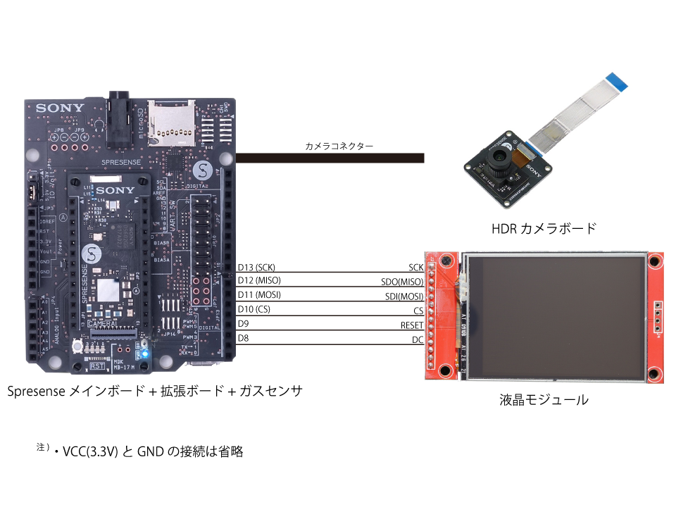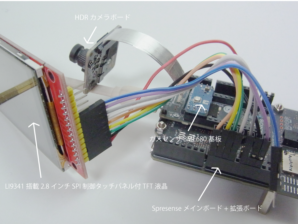 Spresenseメインボードに ガスセンサ BME680基板をAddonし、カメラコネクタによりHDRカメラボード を接続し、Spresenseメインボードと接続したSpresense拡張ボードに、SPIインタフェースを持つ液晶モジュールを次のように接続します。なお、ガスセンサ BME680基板は、I2Cインタフェースにより温度・湿度データを取得します。