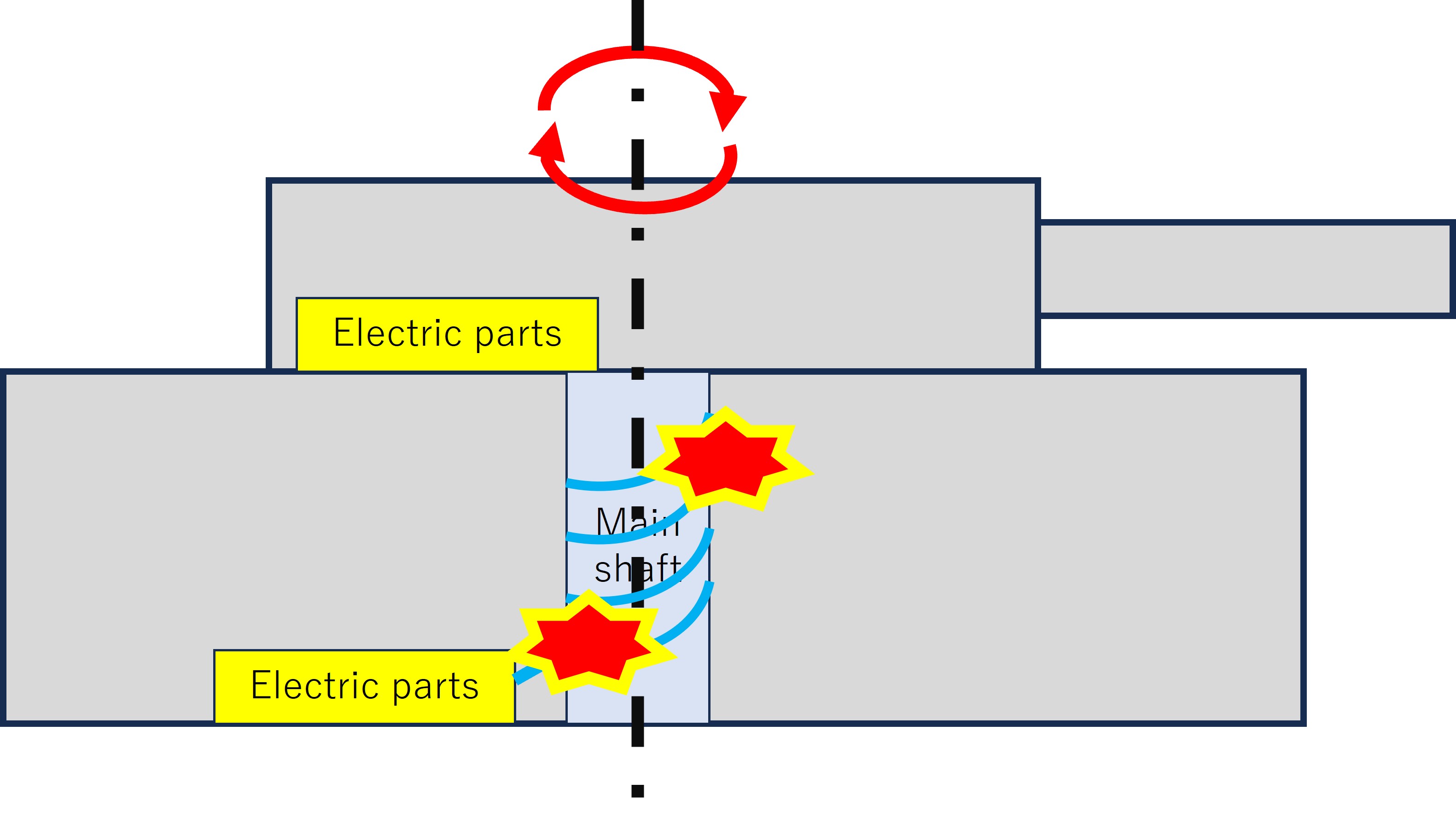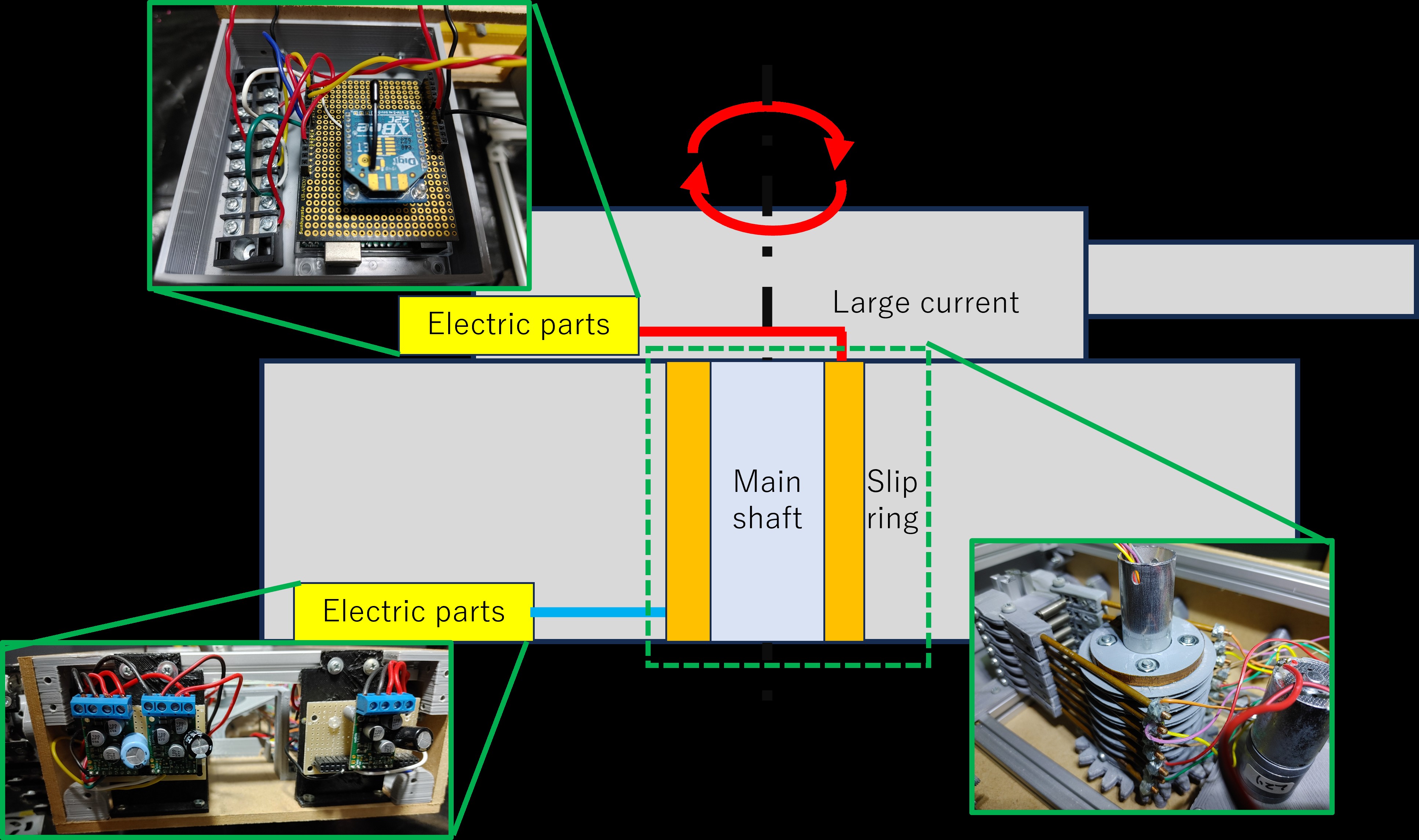 この構成により、スリップリングが回転しながら電気信号を通電できるようになっています。
