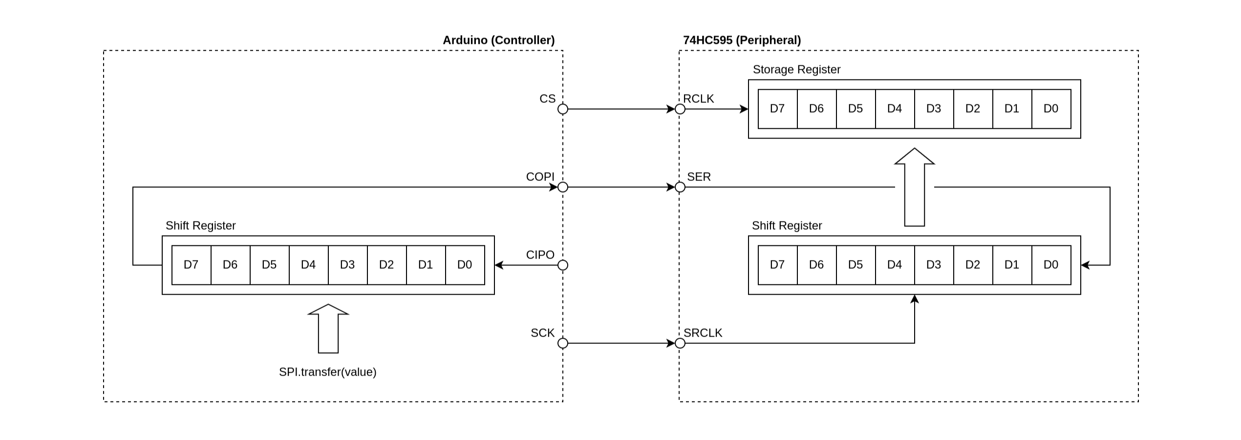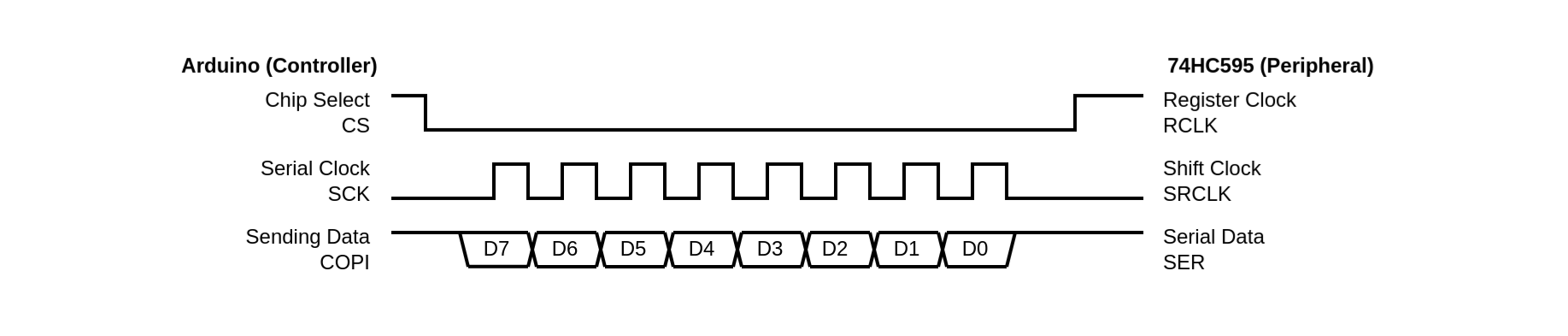 コントローラ (Arduino) 側では、チップセレクト を LOW にすることで通信を開始し、終了したら HIGH にもどす。SPI.transfer() を実行すると、 にデータ D7 がセットされ、シリアルクロック が送出される。 は 8クロック出力され、それにともなって送信データがシフトする。