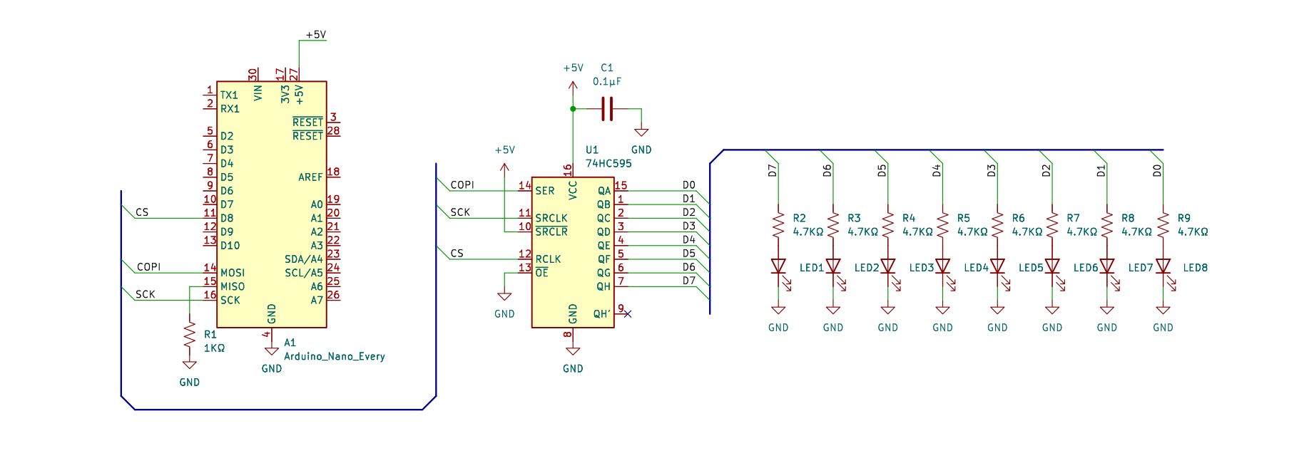 ペリフェラル (74HC595) 側。 は レジスタクロック につながっていて、LOW になっても何も起こらない。 は シフトクロック につながるが、クロックが入ってこなければ何も起こらない。つまり、待機状態。