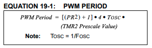 PIC16F18313にはPWM5とPWM6の2つのモジュールがある。CCPにもPWMモードがあり、CCPは2つあるわけで全部で4つのPWMが使えるようだ。ここではPWM5を使ってLチカしてみる。PWM周期は下のように定義されていて、Foscが1MHzもあると1Hz周期まで落とせそうにないため、OSCCONで調整する。