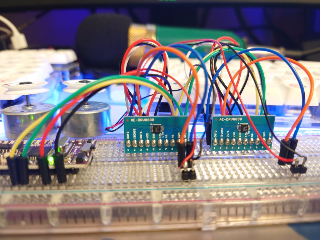 arduino互換の「maker nano」と、I2Cなモータードライバ「DRV8830」、そして適当なDCモーターです。