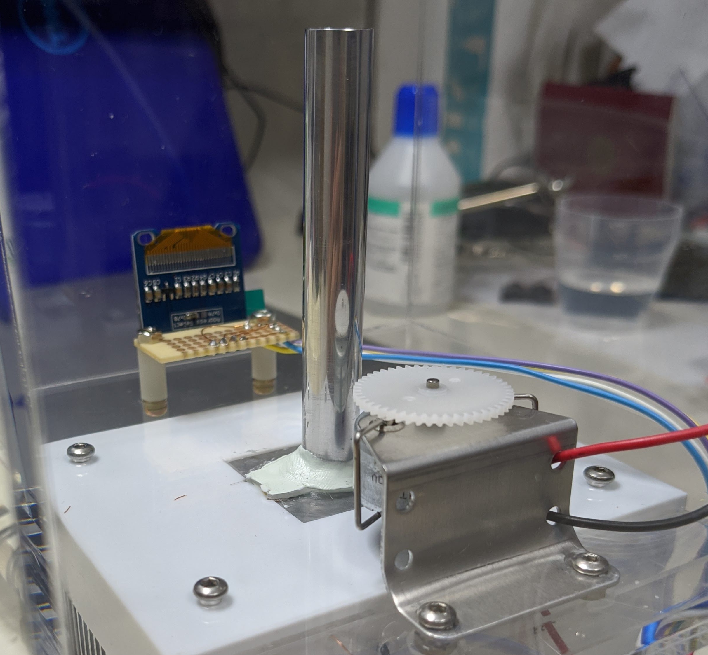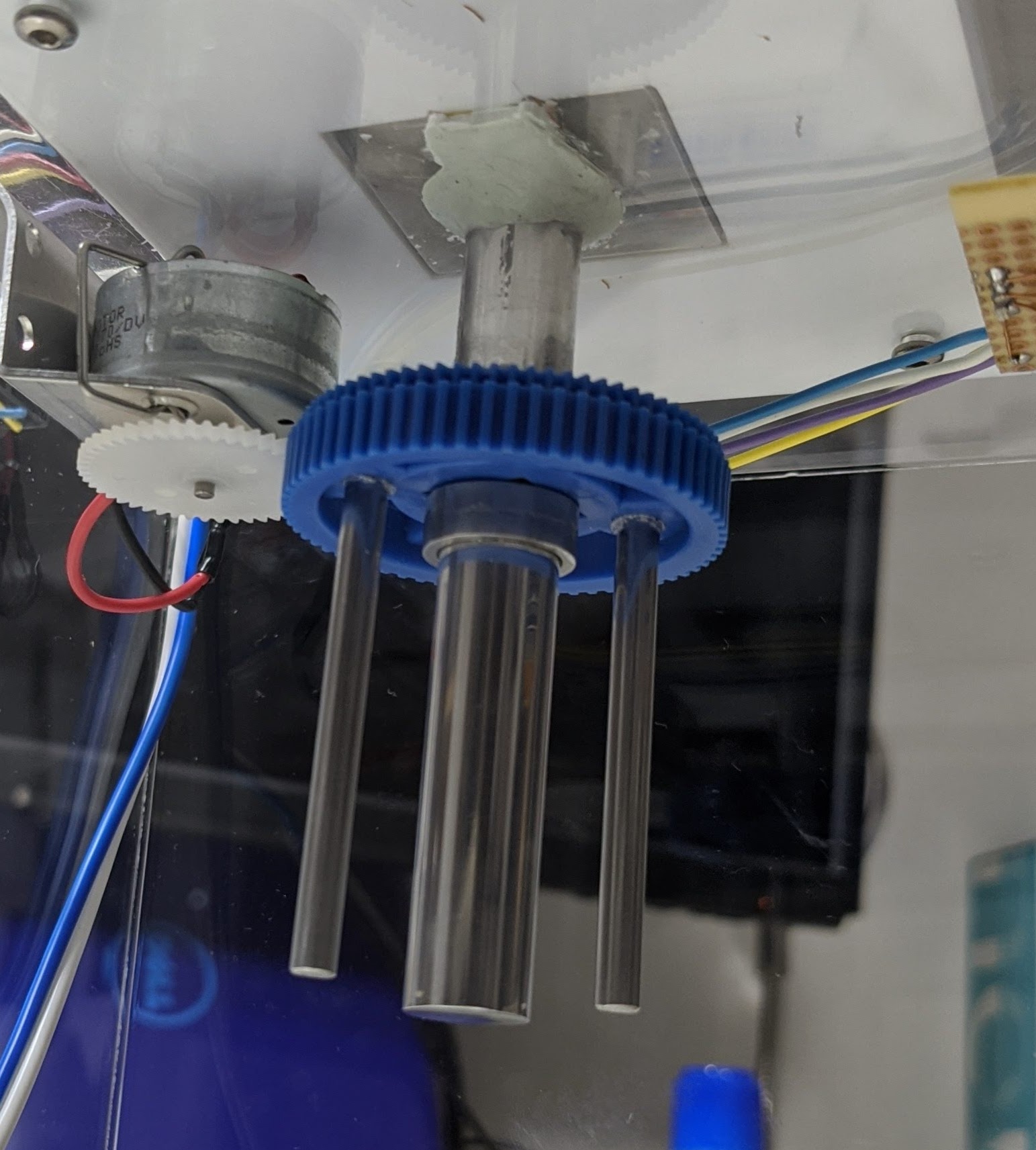 2本のアルミ攪拌棒(径4mmx50mm)を周縁部に取り付けた外径39mmプラスチック歯車をDCモーターで回転させることでマリモ容器内にやさしく水流を起こし、マリモを適度に回転させて陽当たりを均等にすることにした(15分に一回に設定)。この歯車の中心部には11x11mmの正方形の穴がある。この穴に冷却用のアルミ丸棒を貫通させ、それを軸に攪拌用歯車を回転させる。軸方向への動きはアルミ丸パイプ(高さ5mm)を上下に固定することで制限する。歯車の回転はDCモーターに取り付けた別の歯車の回転を伝達させて行う。DCモーターの回転速度はPWMで制御する。始動時だけデューティー比を上げて静止摩擦力を上回るトルクを得たのち、デューティー比を落としてやわらかく回すように調整した。