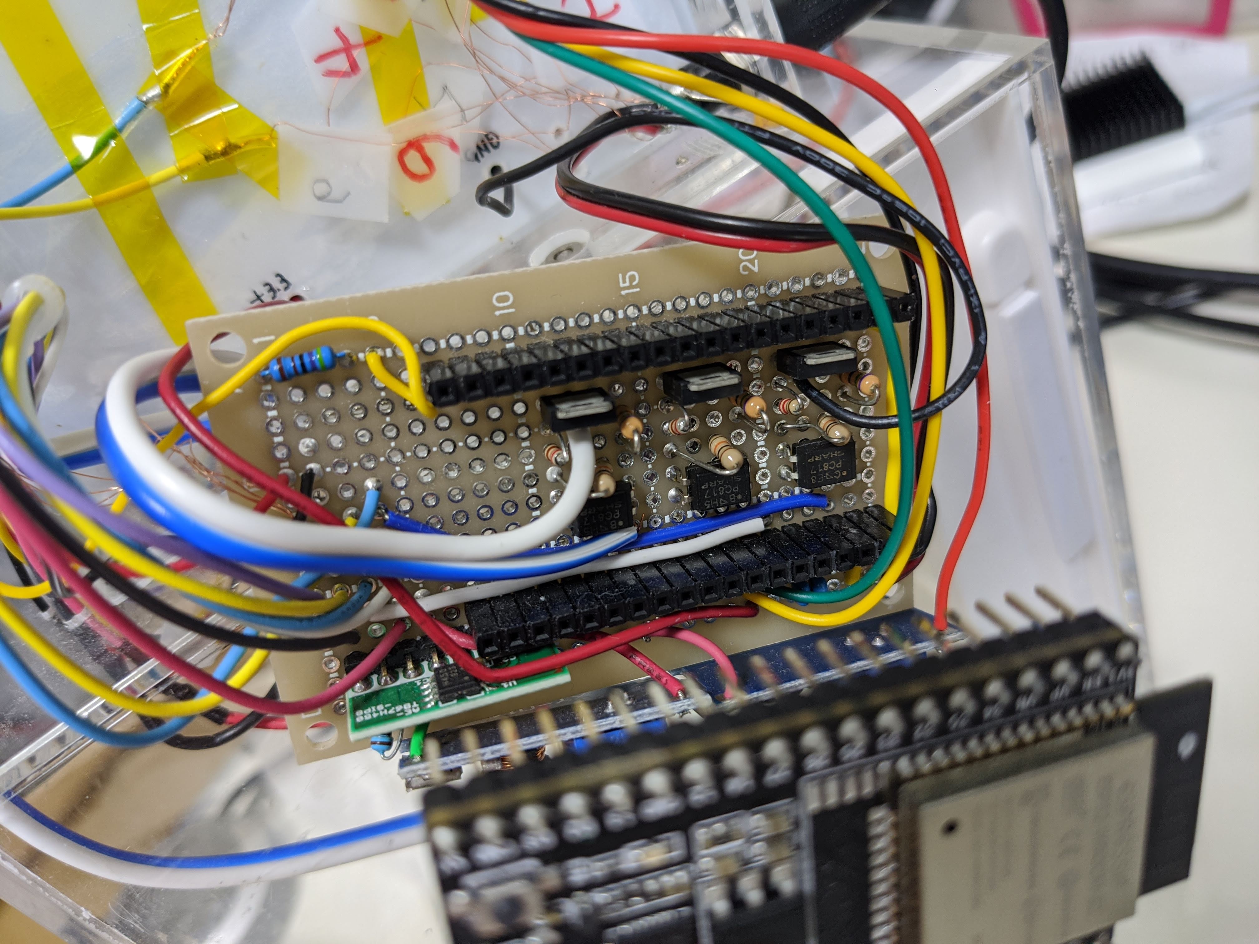 電子回路は冷却・放熱機構を収めた自作ケースの裏側に別のケースをボルト留めして収めた。ESP32Dev-KitCモジュールの実装にあたっては分割ロングピンソケットを使用して着脱可能とすると同時に、基盤からのモジュールまでの間の空間を確保し、その部分にパワー部分の回路を実装することで小面積化を図った。