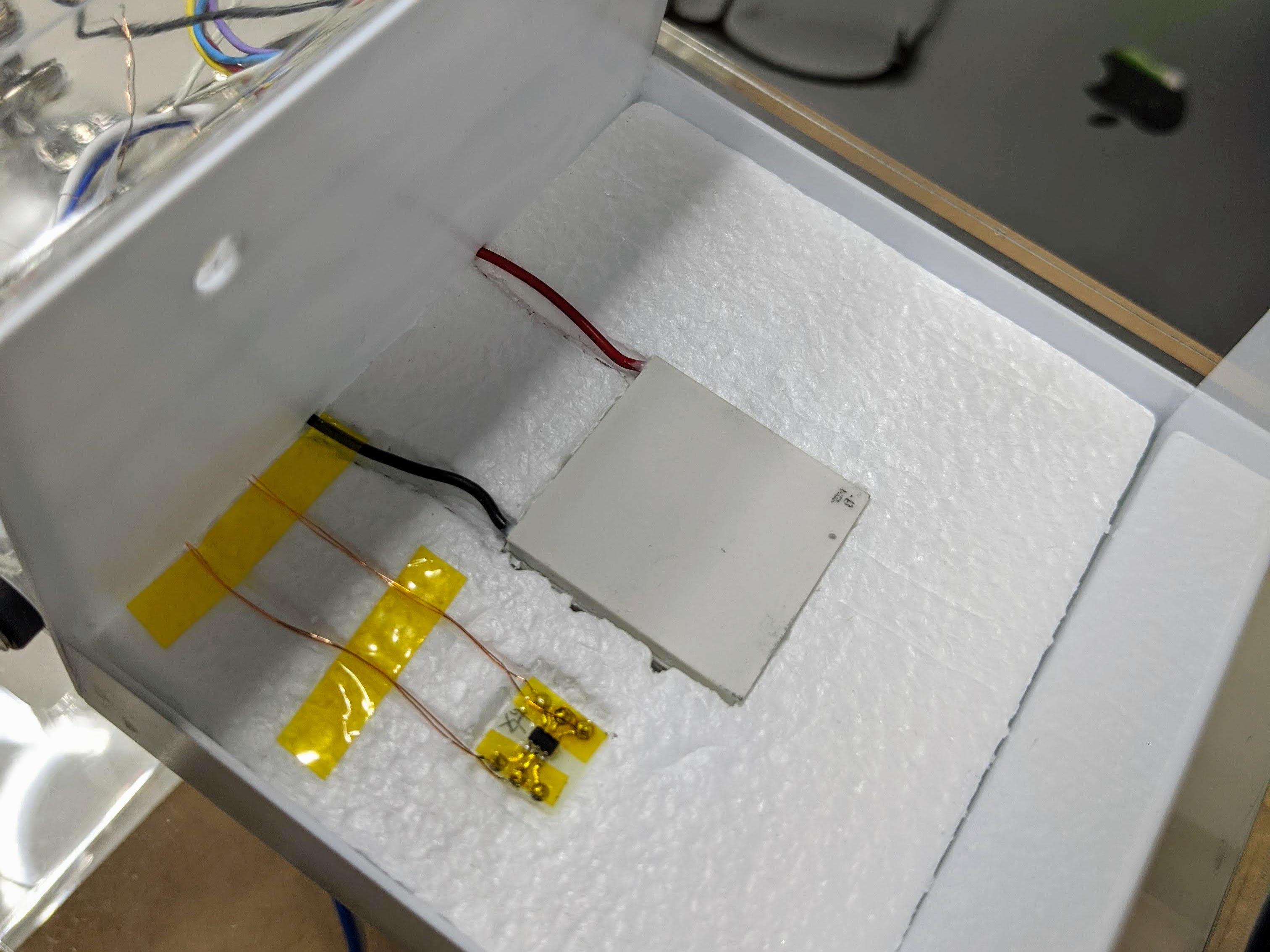 マリモの容器として断熱性の高い二重ガラス構造のグラス(外径82x高さ95mm)を使用した。水の冷却には水面上からペルチェ素子(4.6Aタイプ)で低温にしたアルミ丸棒(直径11x高さ80mm)を水中に浸すことで行う。ペルチェ素子の大きさ(縦横30x30mm)に比べるとアルミ丸棒の径はかなり小さい。ペルチェ素子の全面に密着させて熱伝導を高めると同時にアルミ丸棒の端面からの熱を拡散させるために、両者の間に30x30x8mmのアルミ平角材を緩衝材として挟んだ。これらの部材は放熱用シリコン接着剤で接着し、アルミ丸棒とアルミ平角材の接合部の周りはさらにタミヤパテで固めて強度を上げた。アルミ平角材のまわりは発砲スチロールで断熱を行った。なお、稼働中にはアルミ丸棒とパテにはかなりの結露が生じて滴り落ちている。アルミ平角材のまわりもびしょびしょかも知れない。