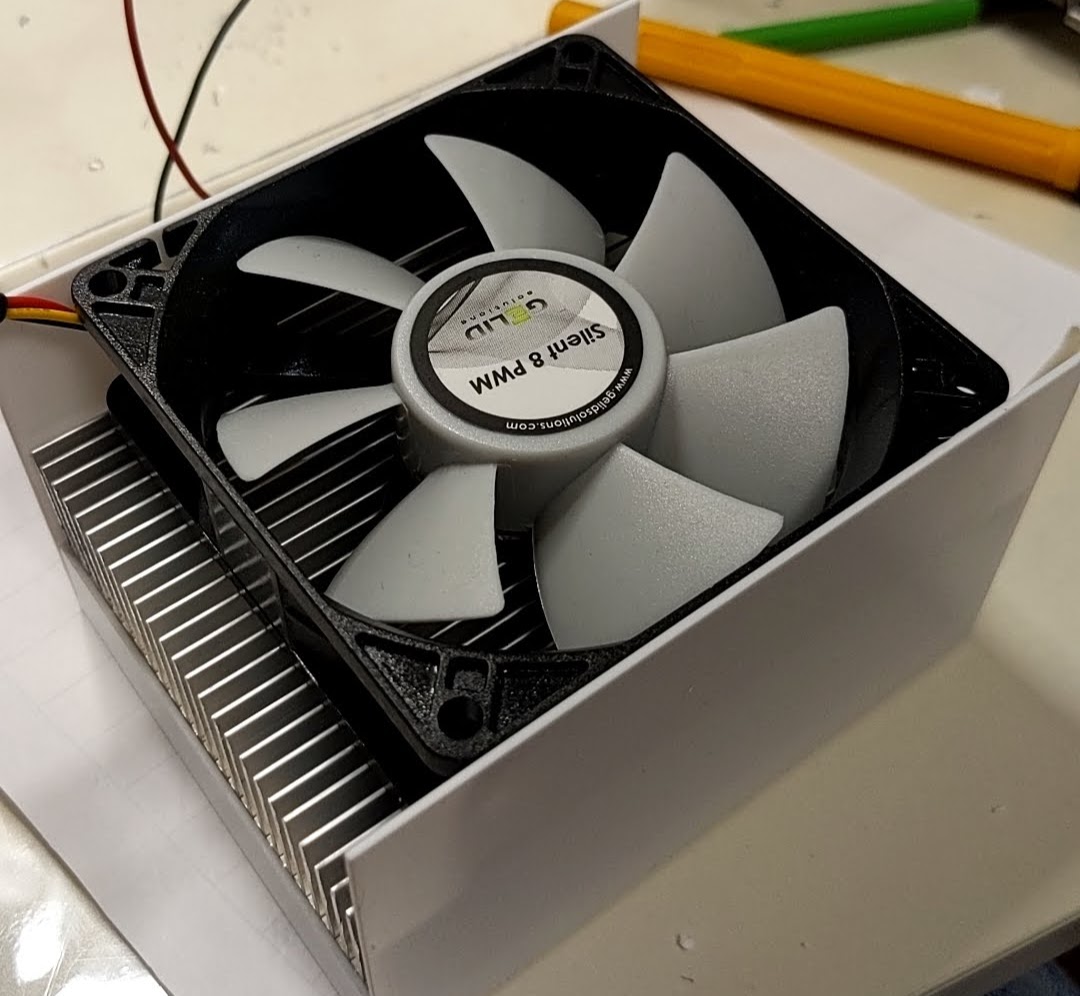 ペルチェ素子は冷却面から反対側の高温面に熱を移動させるだけなので、高温面の熱を逃がさないと連続的な冷却ができない。高温面にヒートシンク(100x80x27mm)を密着させ、上からPC用のファン(縦横80x80mm)で風を送ることで熱を部屋全体に拡散させることとした。なお、ヒートシンクの大きさはPCファンのサイズに合わせて決めたが、こんなに大きくなくても十分な気もする。また、ヒートシンクには温度センサー(S5851A)を密着させて温度を計測し、温度が高い場合にはファンの強さを強くする仕組みとしたものの、運転してみたところ常に最小風量でも十分なようだ。この温度センサーは不要かも知れない。