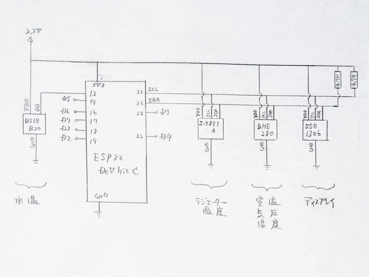 マイコンにはWiFiが使用可能なESP32Dev-KitCモジュールを使用している。本来はこのモジュールはUSBの5Vを電源とするが、3V3ピンに直接3.3Vを供給することでESP32を作動させている。マイコンと水温センサーとの通信には1-Wire、それ以外のセンサーおよびディスプレイとはI2Cを使用している。