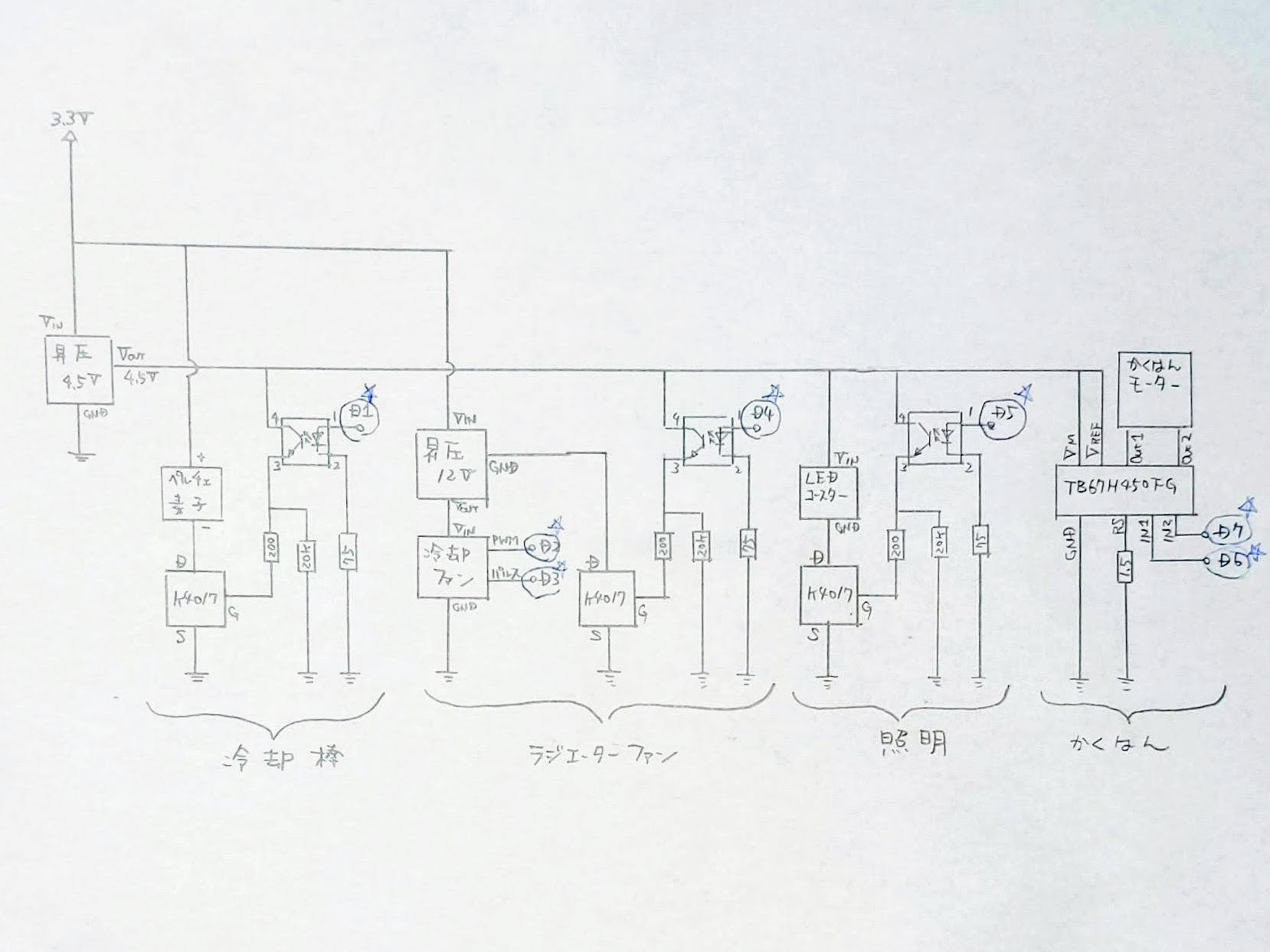 ペルチェ素子などを駆動するパワー部分の回路と制御のためのデジタル部分の回路に分けて説明する。主電源には3.3VのDCアダプターを使用した。