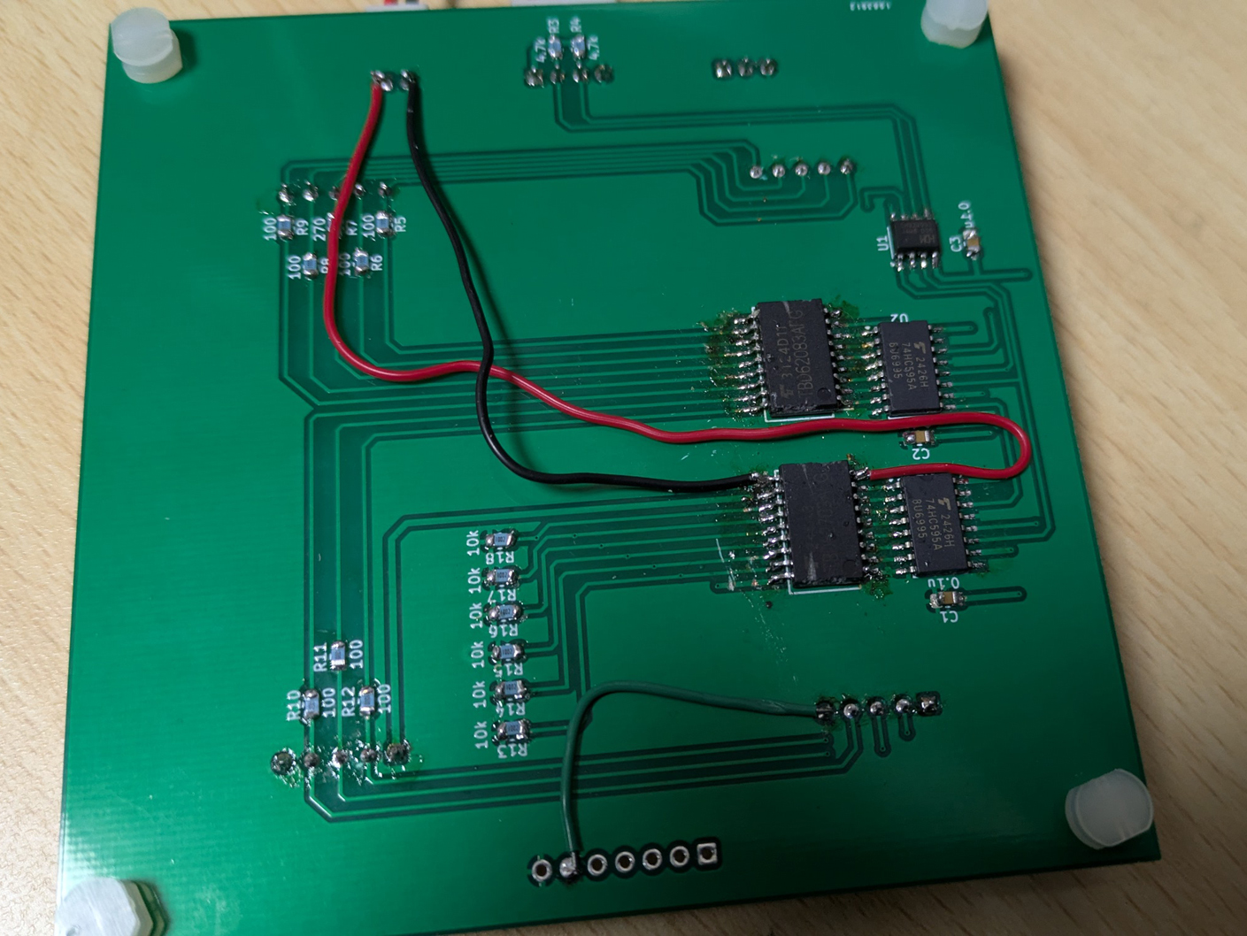 今回製作した回路を基板業者に発注して基板を製作しました。しかし、私の確認不足で設計にミスがあり、ジャンパををして修正しました。(回路図の回路は今回修修正したものの回路図です。)