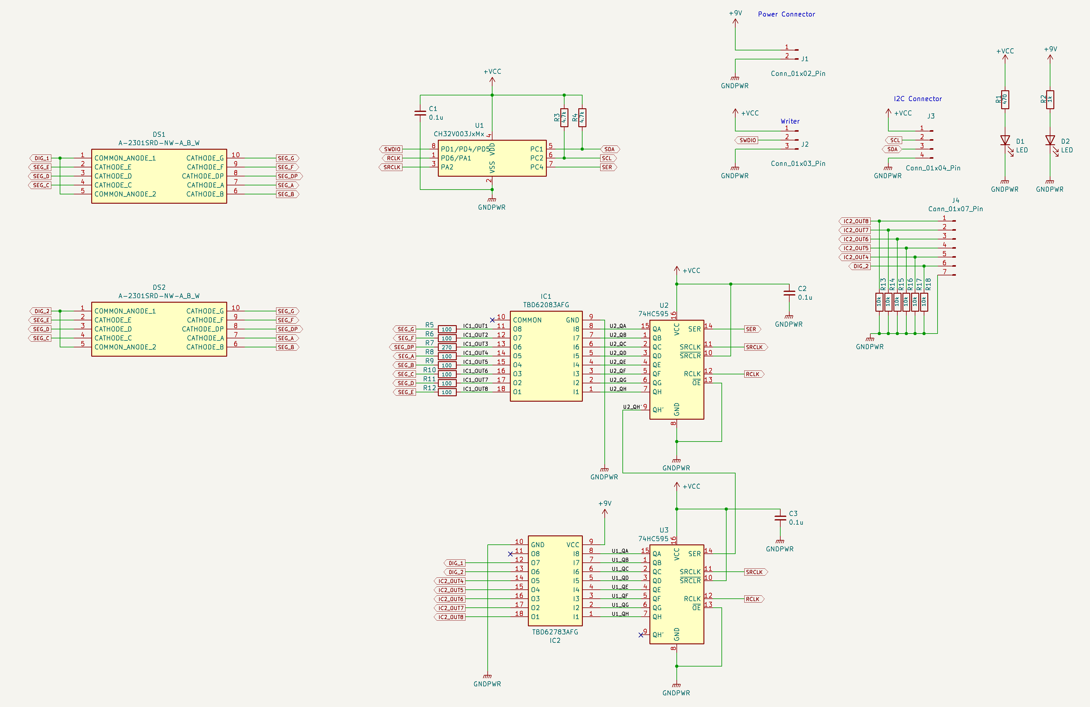 I2Cで受け取った7セグメントの表示データを74HC595でシリアル出力にして、ソース型のトランジスタアレイとシンク型のトランジスタアレイを使用して7セグメントLEDをダイナミック点灯をできるように回路を製作しています。