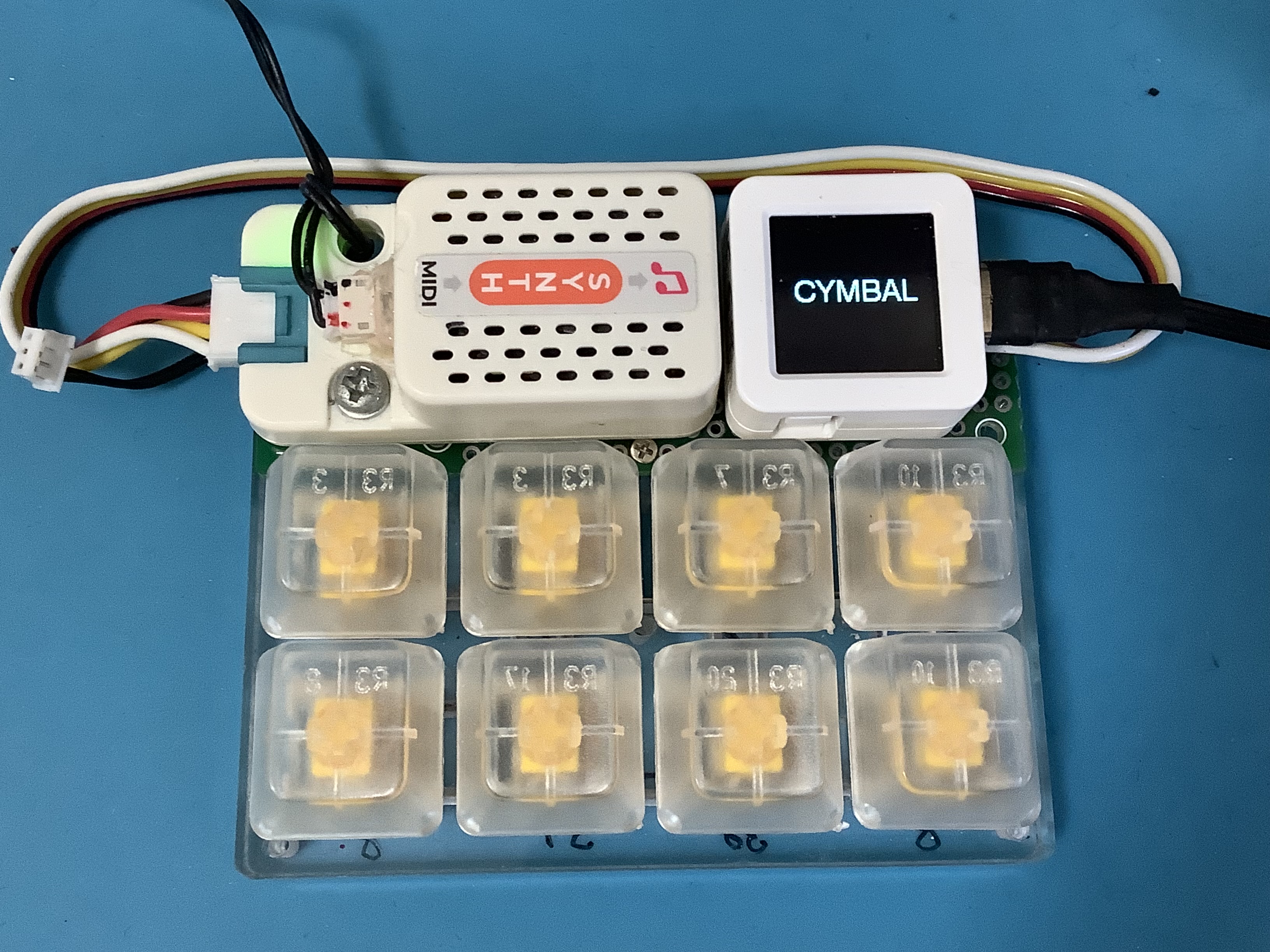 配置の都合で8キーにしましたが、M5AtomS3はGPIO端子が6個しか無いので、H.H.CとCYMBAL をダブルにしました。