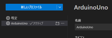 VSCodeの左下にある歯車マークからプロファイル→プロファイルと進み、左上の「新しいプロファイル」をクリックして「ArduinoUno」というプロファイルを作成する。しばらくArduino開発を続けるなら「このプロファイルを新しいウィンドウの既定として使用する」にチェックを入れてもよい(切り替えは容易なので)。