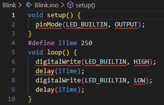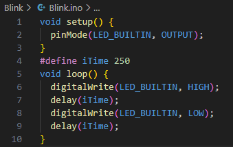 Arduino拡張機能を入れてから(Blinkフォルダーでなく)Arduinoフォルダーを開いた状態で「Blink.ino」を参照すると、波線で真っ赤になっている。