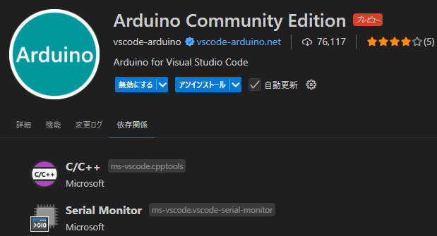新しいプロファイルには拡張機能がほとんど入っていない。Arduino開発で明示的に入れる拡張機能はMicrosoftのArduinoではなく「Arduino Community Edition」だけである。