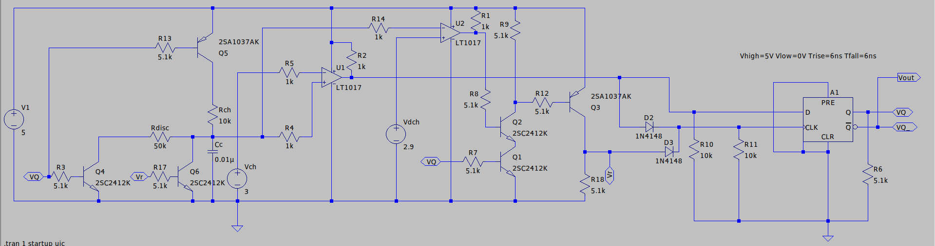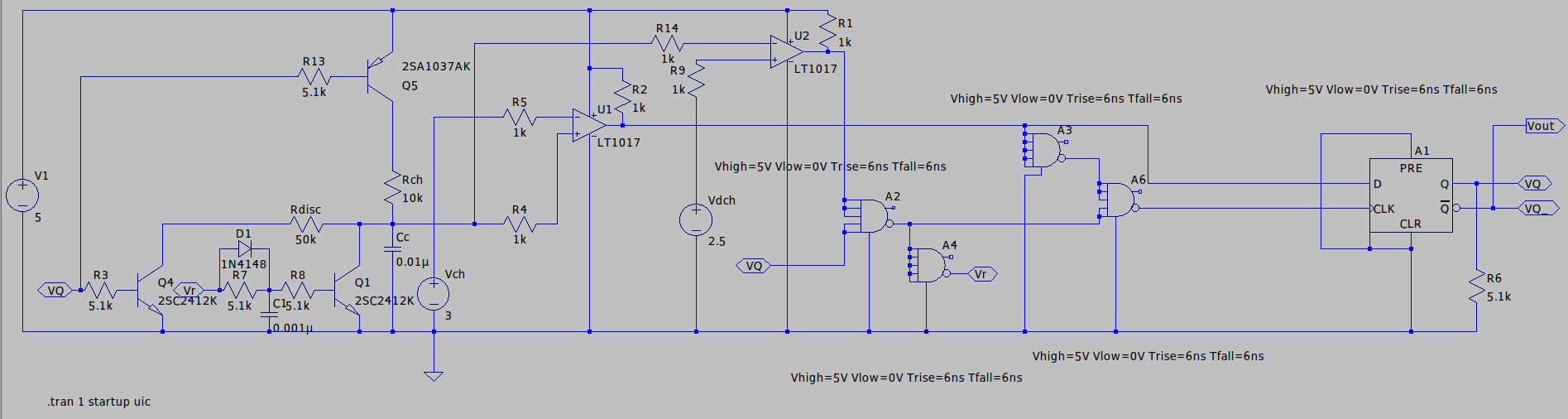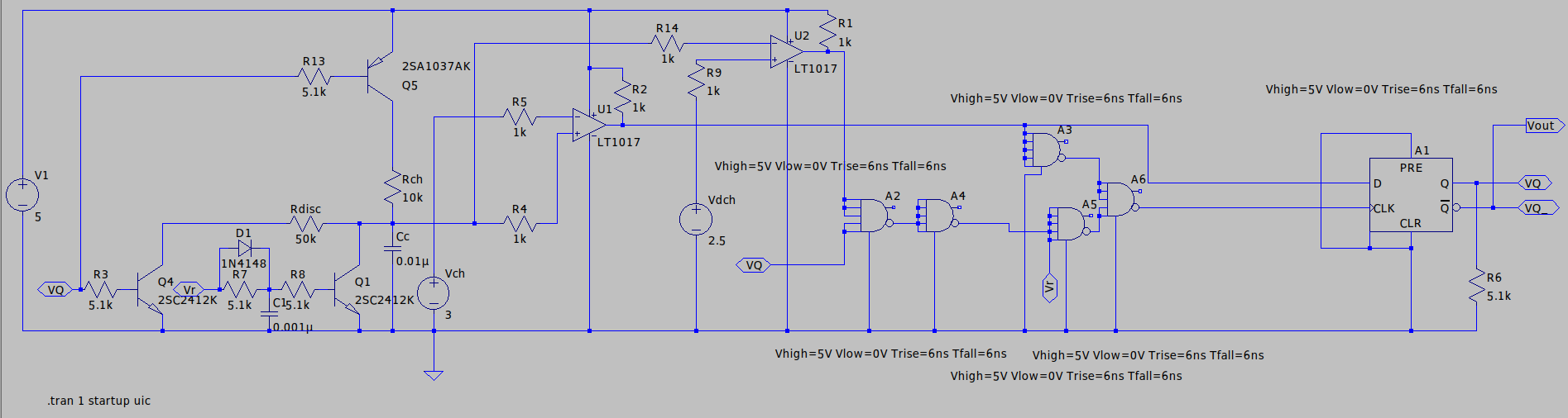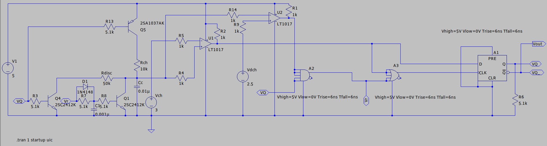2:Q5がoff,Q4がonになり、toffの期間に入ります。Rdiscを界してCcの放電が開始されます。Ccの電圧がVdchになるとQ6がオンになってCcが完全に放電されます。このとき、フリップフロップA1にU2からパルスが送られて出力を反転し、出力を0→1に反転します。同時にQ6がonになってCcが完全放電されます。またQ5がon,Q4がoffになり、再びtonの期間に入ります。