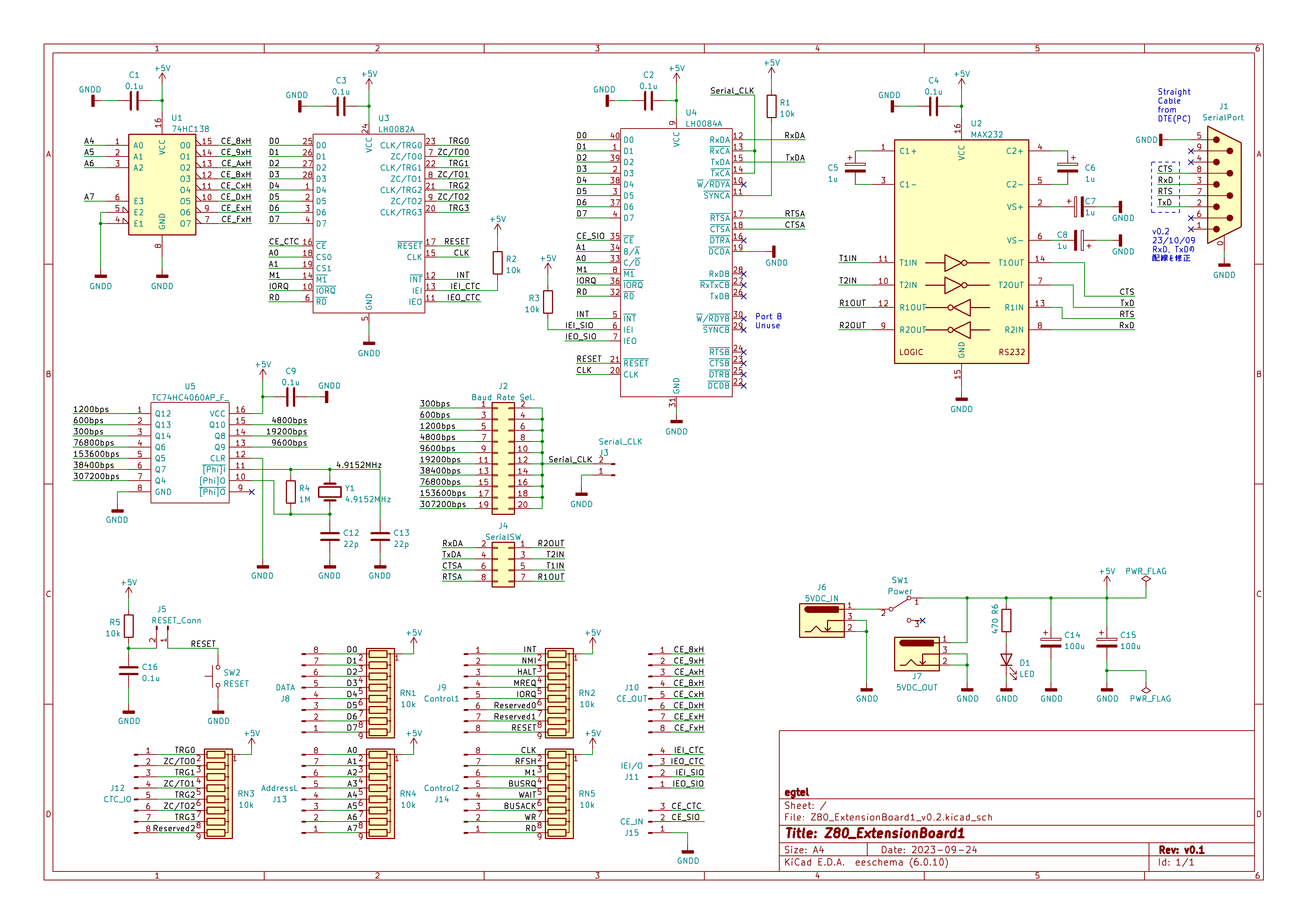 この課題を克服するために、Z80ファミリにラインナップされているCTC(4ch 8bit タイマー)とSIO(シリアルインターフェース)を搭載した拡張ボードを設計・制作した。本記事では、作成した拡張ボードの回路構成とその動作を紹介していきたい。