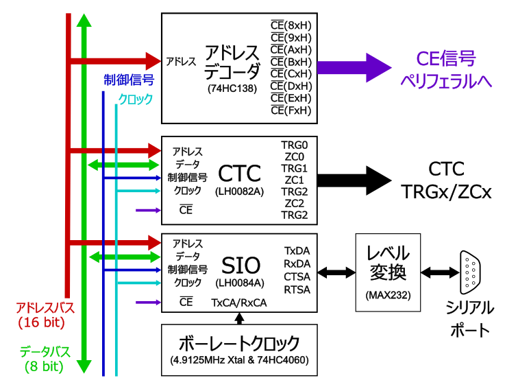 - アドレスデコーダ:アドレスバスのA5-A7(3bit)から、8種類のCE信号を生成する回路。CTCとSIOへのCE信号もこの回路から生成される。