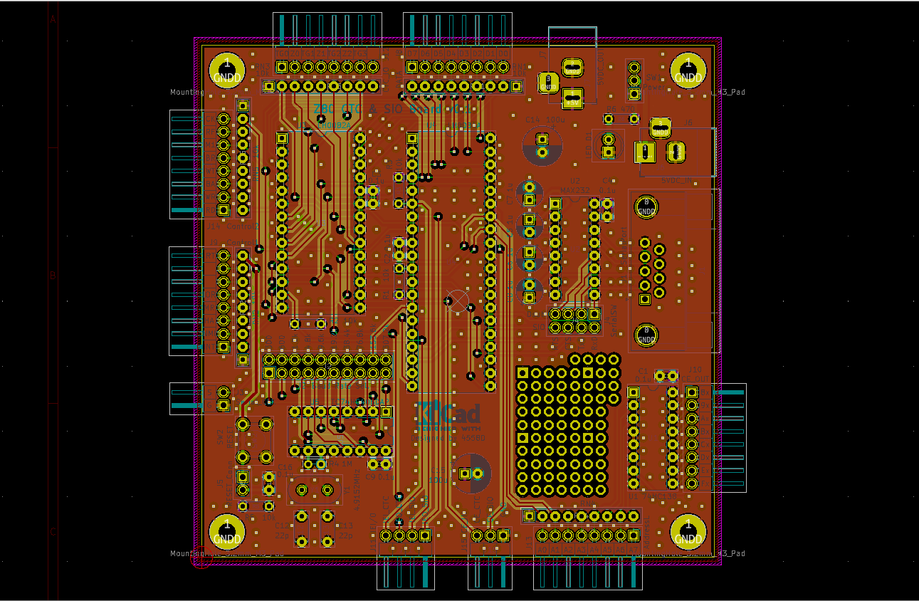 また、PCBパターンは以下のようにした。回路図の回路に加え、空き領域に2.54mmピッチのユニバーサル基板領域を仕込み、簡単な拡張や回路修正ができるようにしている。