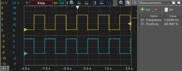 上(黄色)がRA2、下(水色)がRA5であり交互に50%デューティ1Hz周期で点滅する。