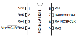 まずは今回の「Lチカ」だが実際にはLEDは接続せず、オシロスコープでピンの電圧をモニタする。このLEDを接続したつもりになるピンの選定だが、電源とPICkit4の通信ライン(ICSP)とリセットで8ピンのうち5ピンを使っているし、動作(速度)モニタのためにCLKOUT(RA4)するので、結局RA2とRA5しか空いてないことになる。