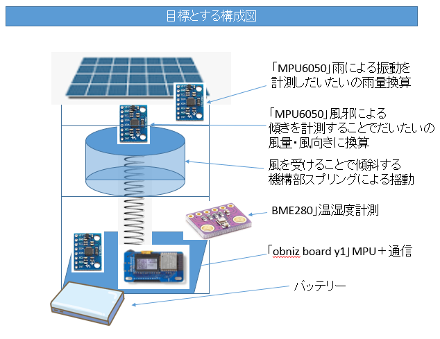 そこで、6軸加速度センサーを使い計算アルゴリズムでおおよその風速、雨量を求めます。