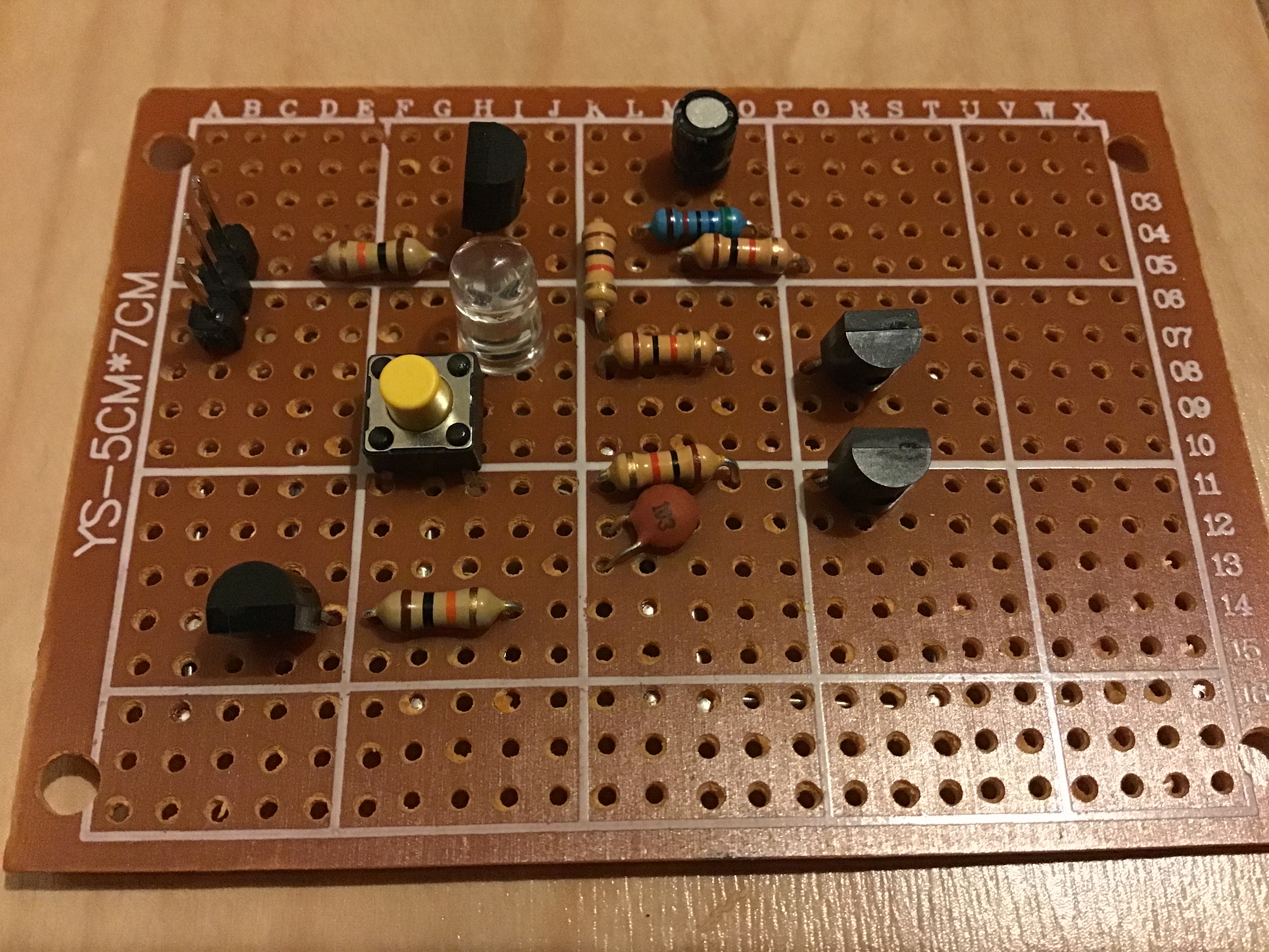 この時間を短くするには、スイッチの横にあるパスコンの容量を小さくすれば良いのですが、これ以上小さくすると電源を入れた時に誤作動してLEDが光ってしまいました。