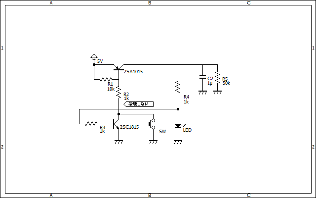 スイッチが押されると、自己保持回路がONしB点の電圧が上がり、LEDが点灯します。