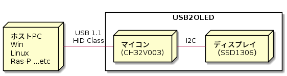 ホストPCとマイコンはUSB1.1で接続しHIDクラスを使ってコマンド+表示データを送ります。マイコンは、そのコマンドを解釈してしOLED用の表示コマンドに変換します。変換されたコマンドはOLEDにI2Cで送信されます。