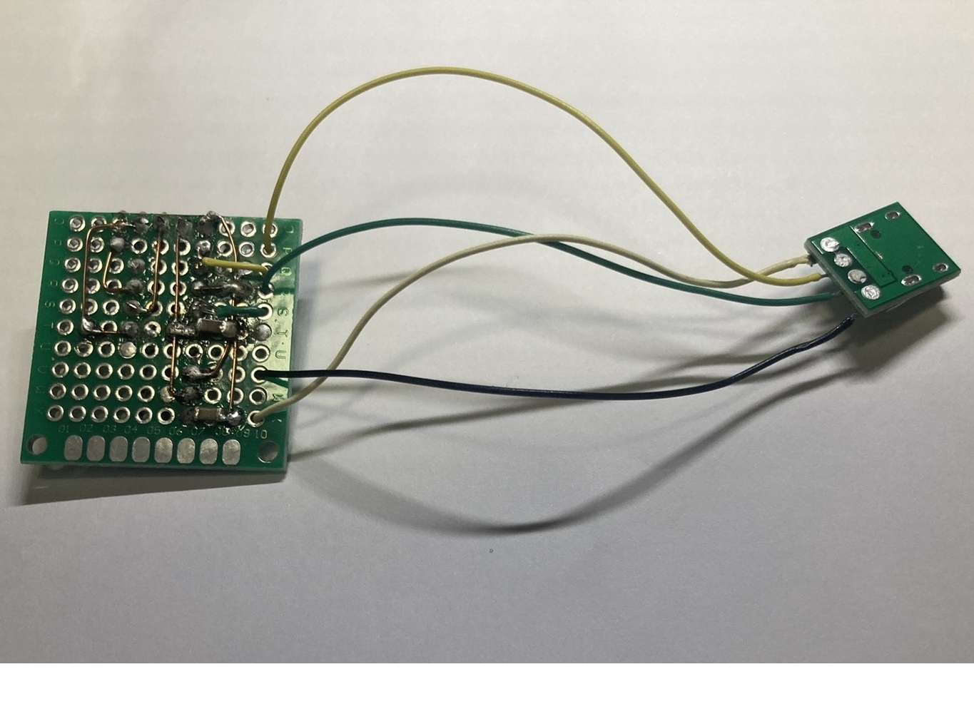 ユニバーサル基板&チップ抵抗を使って手半田で実装したので裏は結構ごちゃごちゃ。SSD1306は取り外しできるようにピンソケットを介して接続。CH32V003J4M6は失敗しても安いので気楽に直付け。(でもマイコンチップよりブレイクアウト基板の方が高価だったりする)