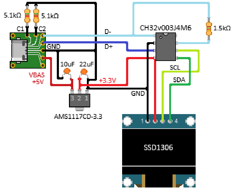 3.3Vに降圧するレギュレータ(AMS1117)は、もっと入手しやすいドロップが小さいモノに変更した方がいいかもしれません、もしくは、CH32V003とSSD1306は5Vでも動作するので、そのまま直結しても動作すると思われます。ただし、その場合はI2Cライン(SCL/SDA)は分圧などして3.3Vにする必要があります。あと、パスコンのコンデンサ容量はあまり詳しくないので適当です...。無くても動くかも。