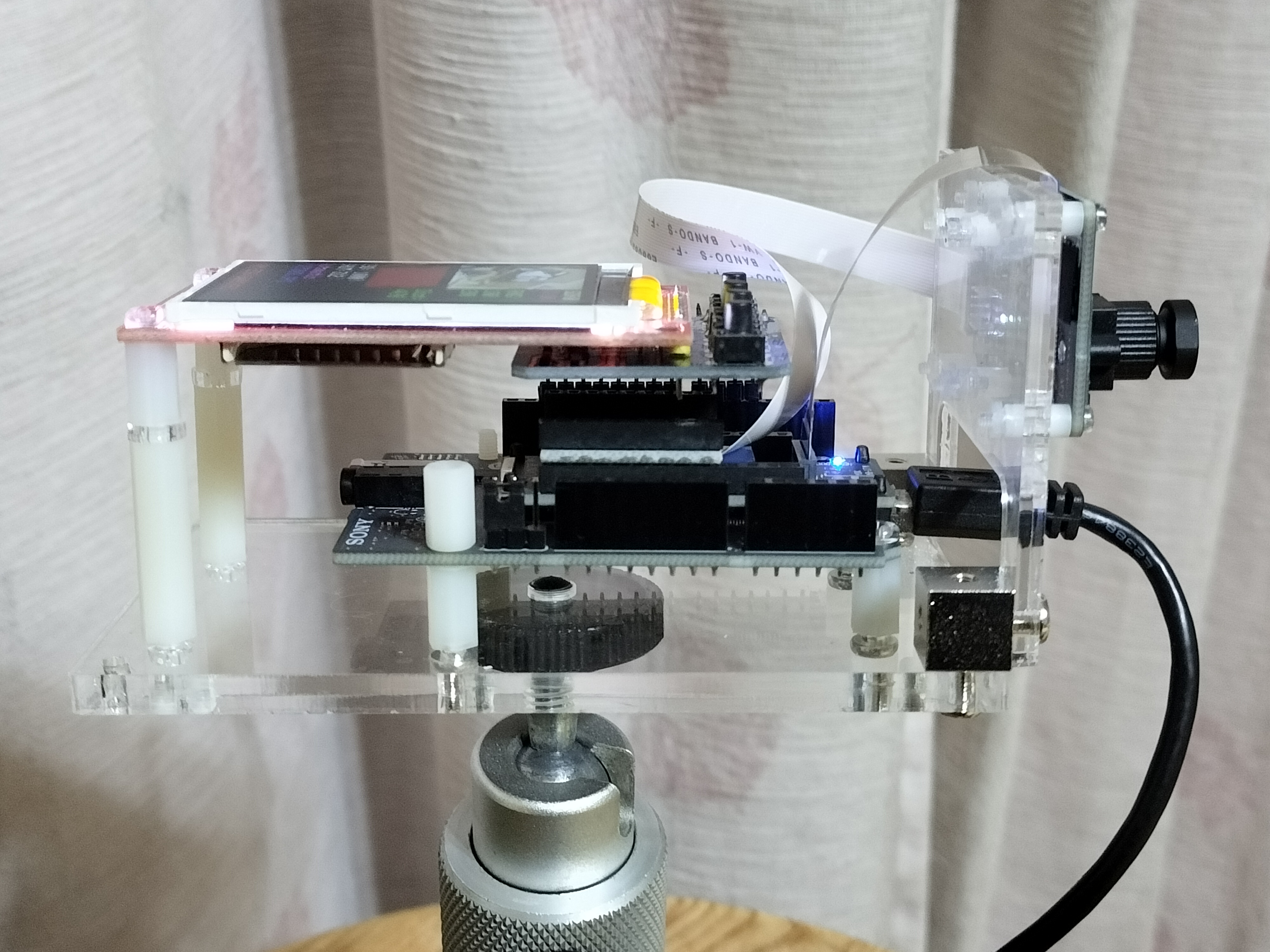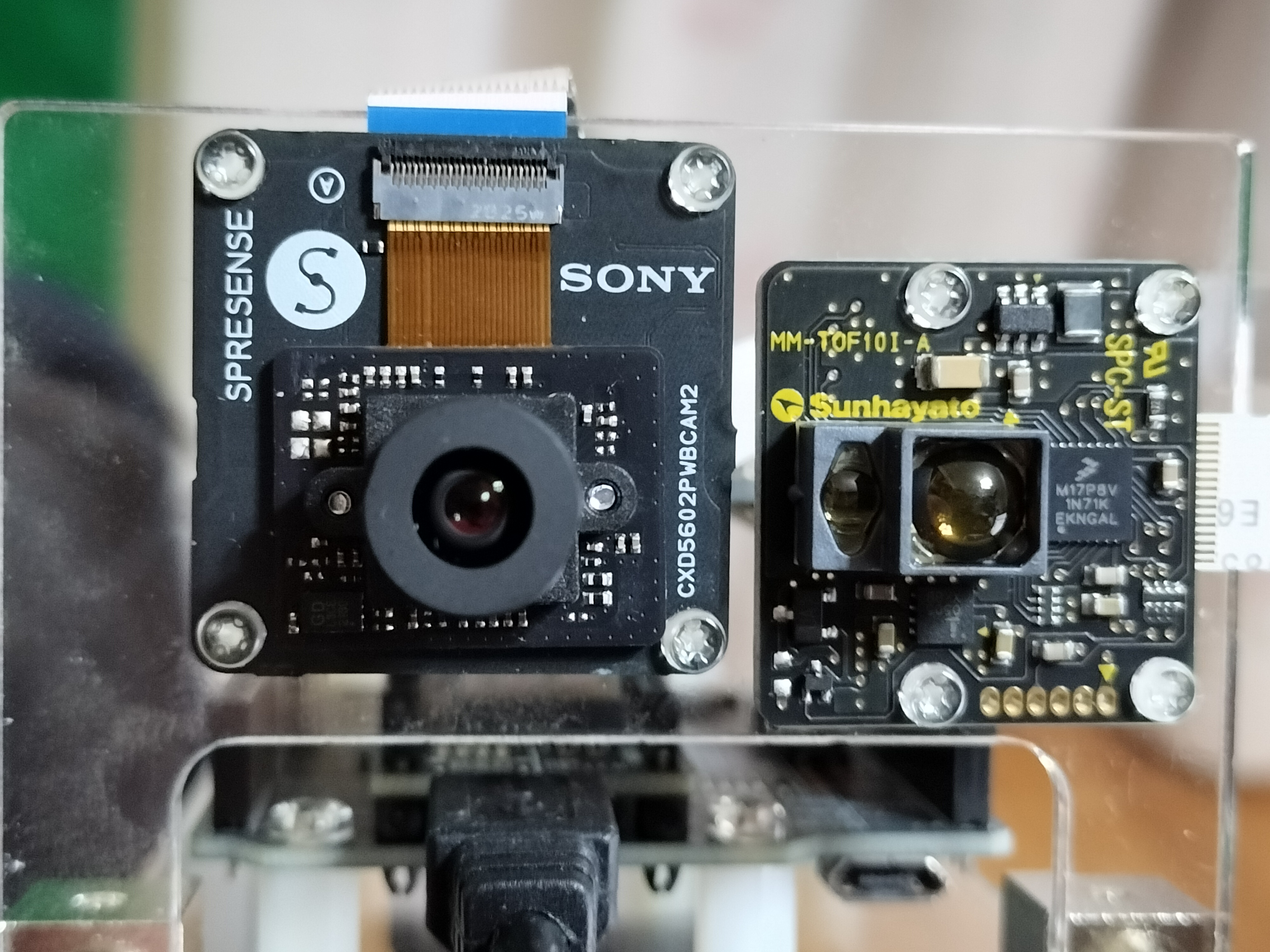 - HDRカメラとToFセンサモジュールを固定用アクリル板2に取り付けます。HDRカメラとToFセンサモジュールのレンズ中心位置の垂直位置を合わせるようにします。