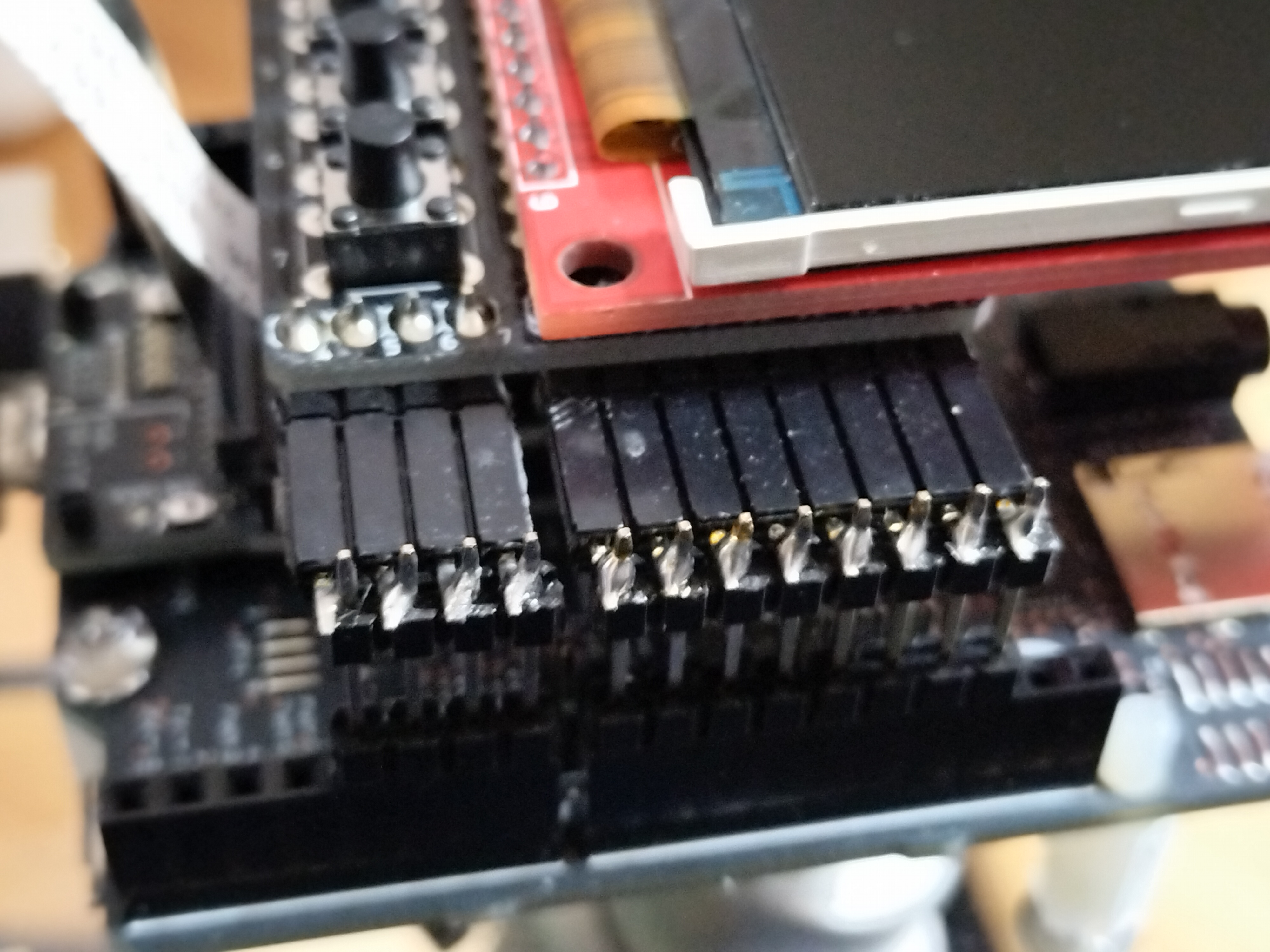 - LCDをピンヘッダとピンソケットを使い90度折り曲げてSpresense拡張ボードに取り付けます。