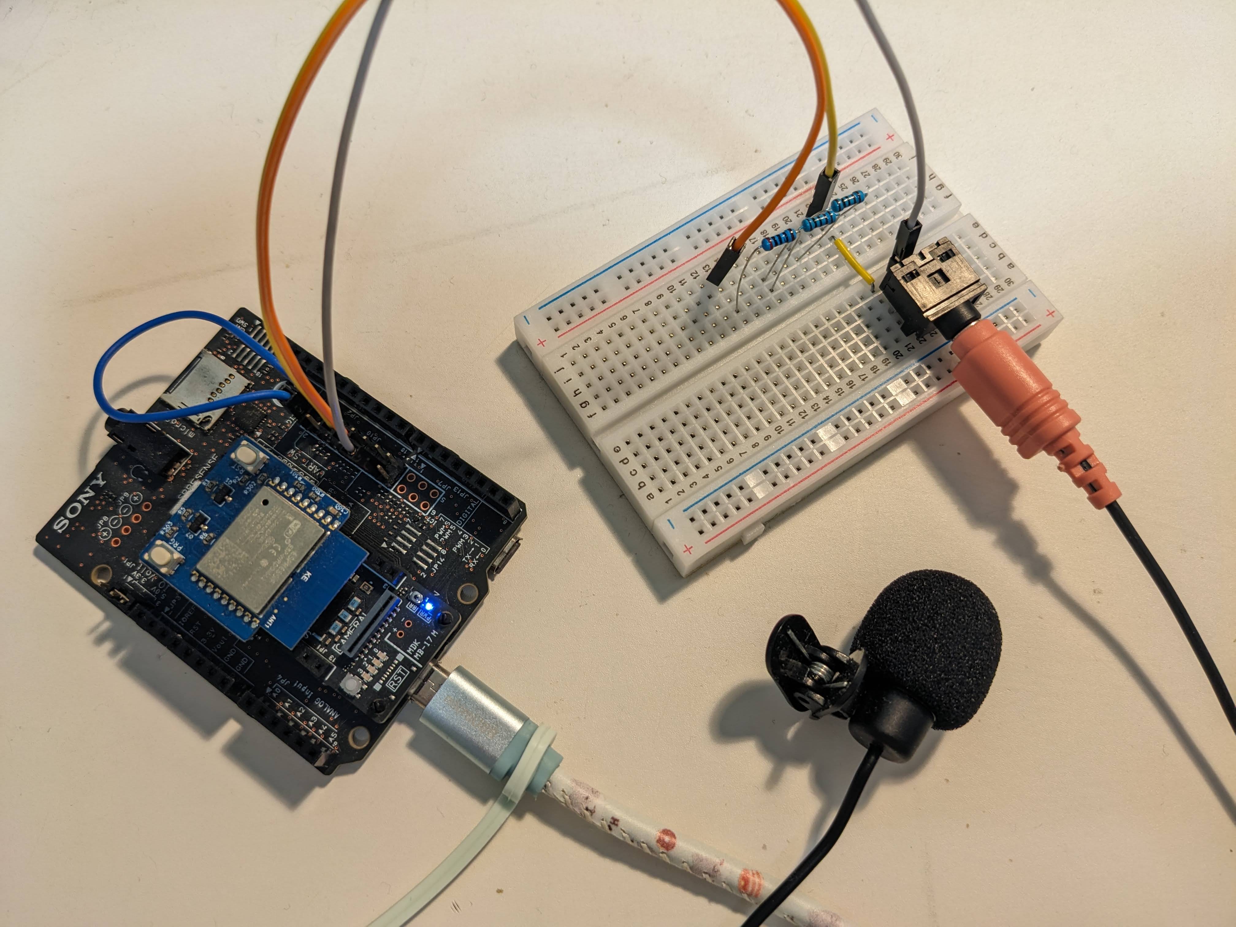 Spresenseの本(「SPRESENSEではじめるローパワーエッジAI」)とネット情報を参考に、まずはブレッドボードで単純に録音ができる装置を作りました。