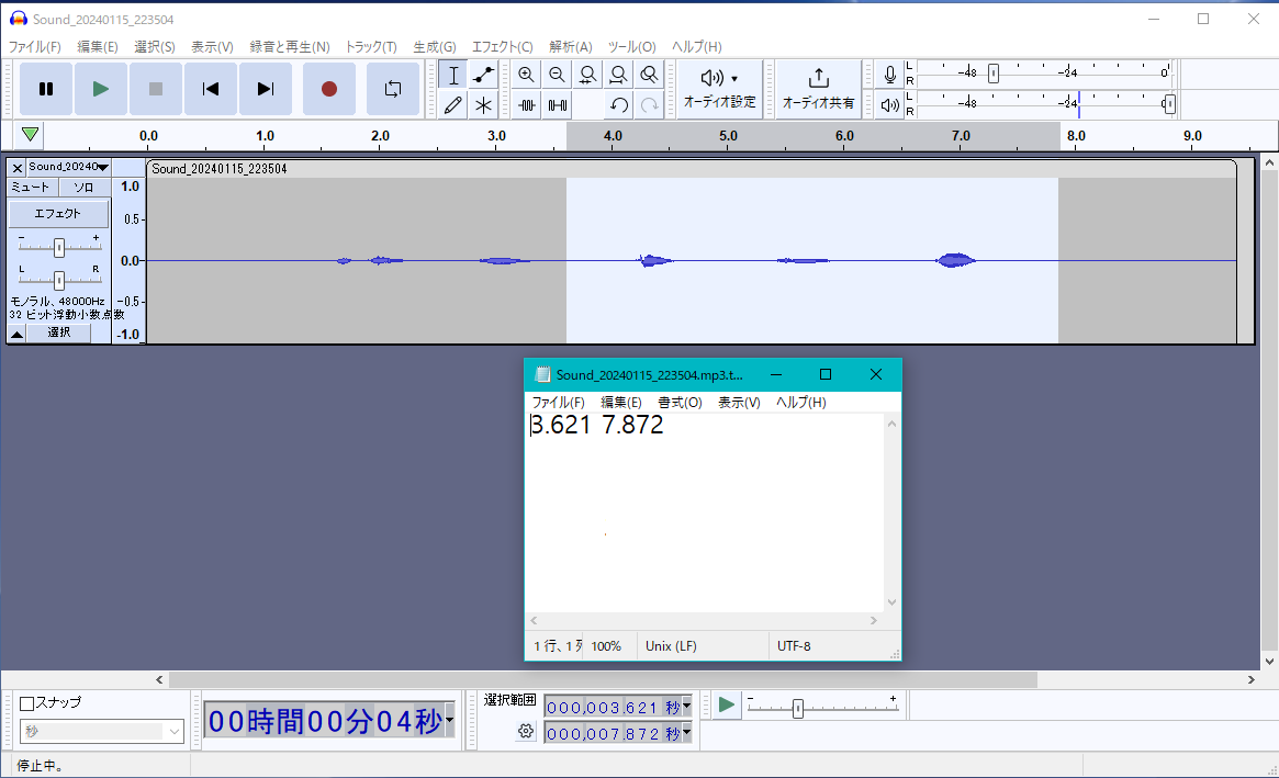 上記の例ですと、開始から3.621秒~7.872秒の間が切り出したいmp3ファイルとなります。