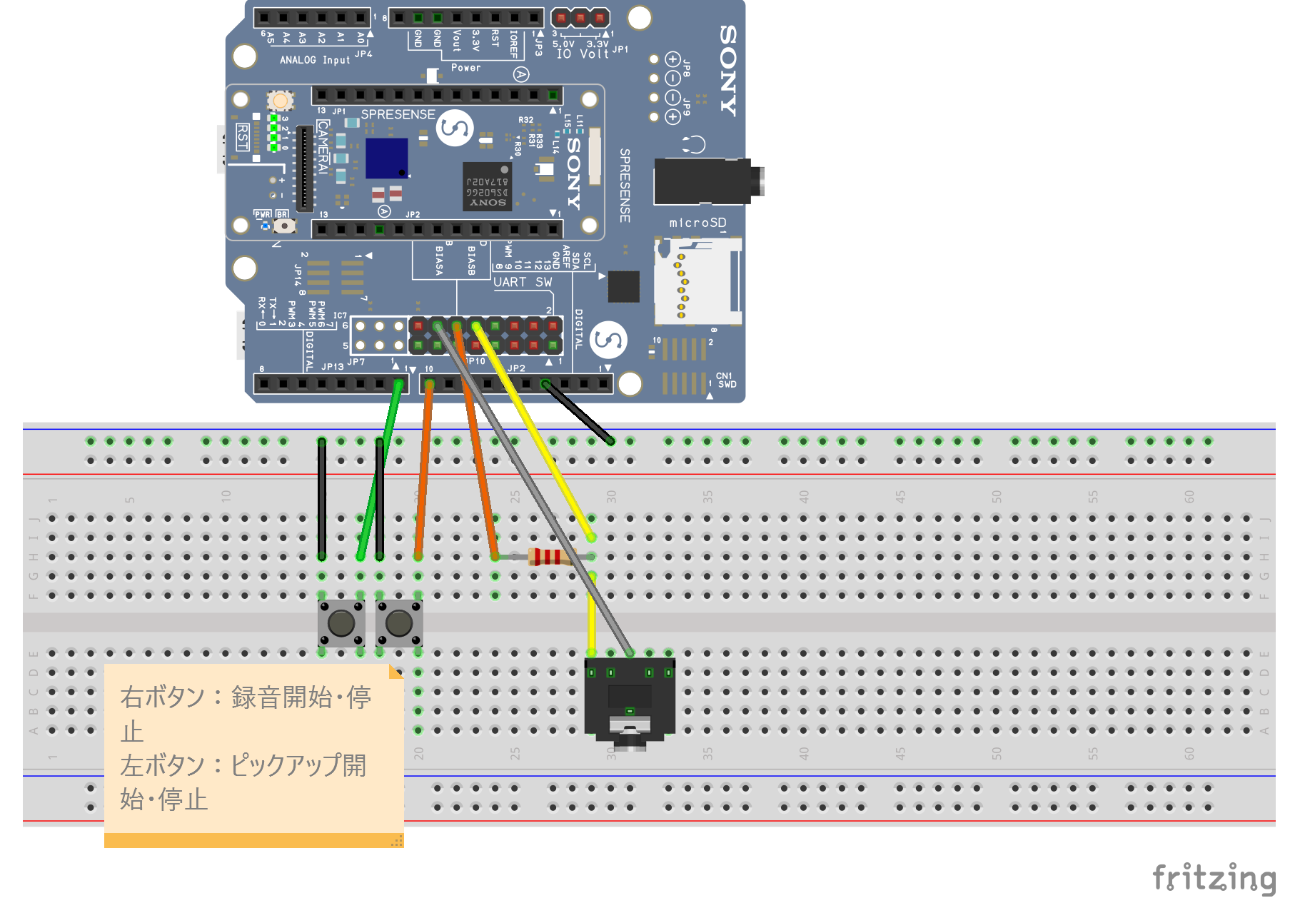 (最初のブレッドボードでの回路図からピックアップボタンのピン番号(緑色)が変更になっています)