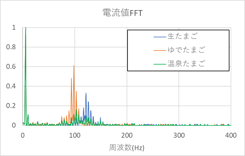ゆでたまご、生たまご、温泉たまごそれぞれについて同様の測定を行いFFT処理して周波数特性を比較したところ、100~120Hz付近の小さな周期の波がたまごの状態に伴う特長を多く保持していました。