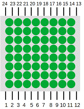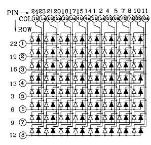 A-3880EGのデータシート(a3880eg.pdf)によると、内部の配線は以下のようになっています。以下の図の端子の並びは製品と異なるので、番号と行、列の対応だけ確認します。この部品は本来赤と緑の2色の合計128個のLEDが含まれているため、単純に考えると256個も端子が必要になる計算になりますが、陽極や陰極を共通にすることで回路は複雑になるものの、端子は22個に収まっています。