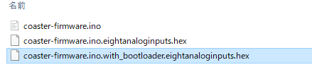 この中の,coaster-firmware.ino.with_bootloader.eightanaloginputs.hexを書き込みます.(PCの設定によっては最後の.hexが表示されないかもしれません)