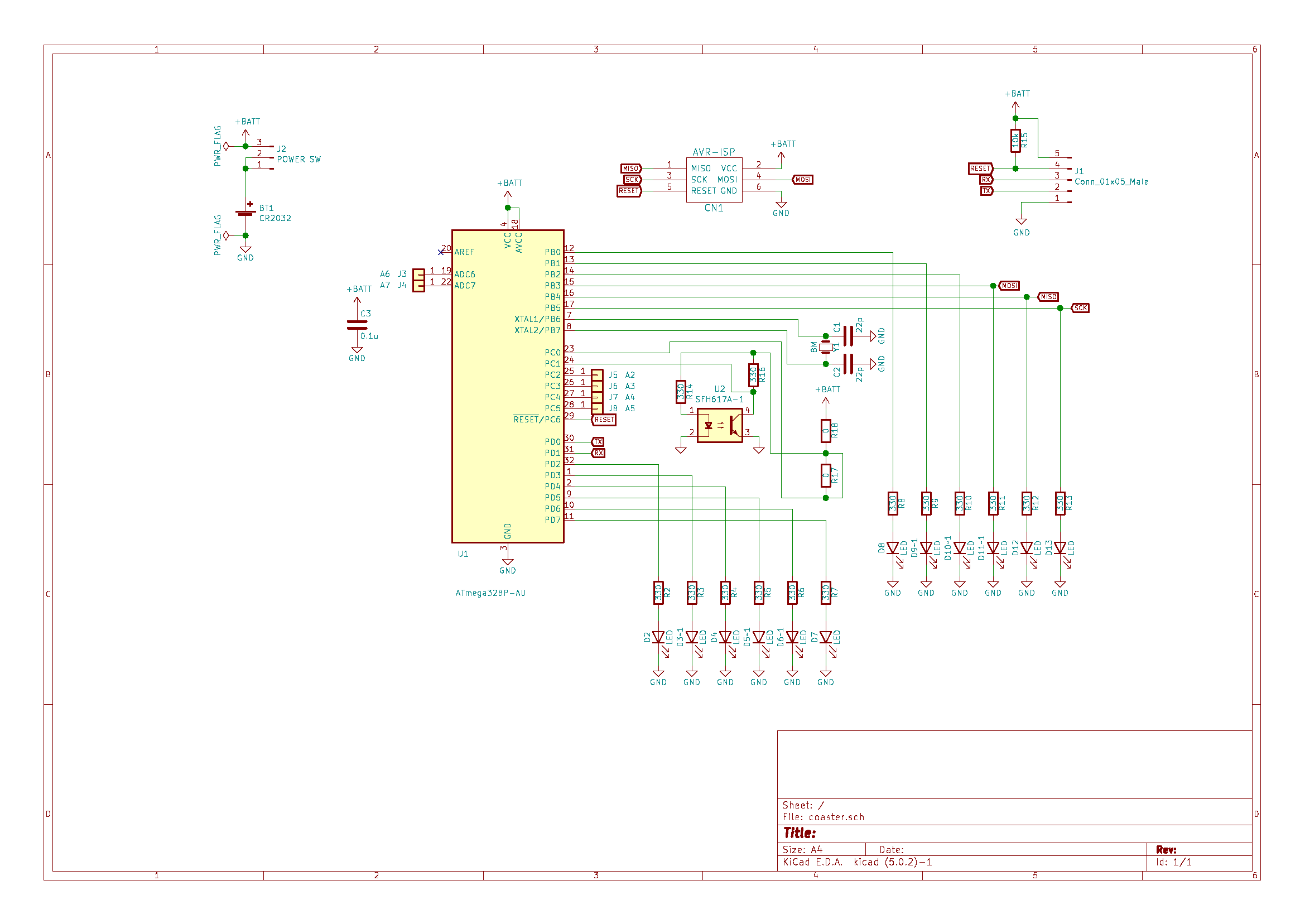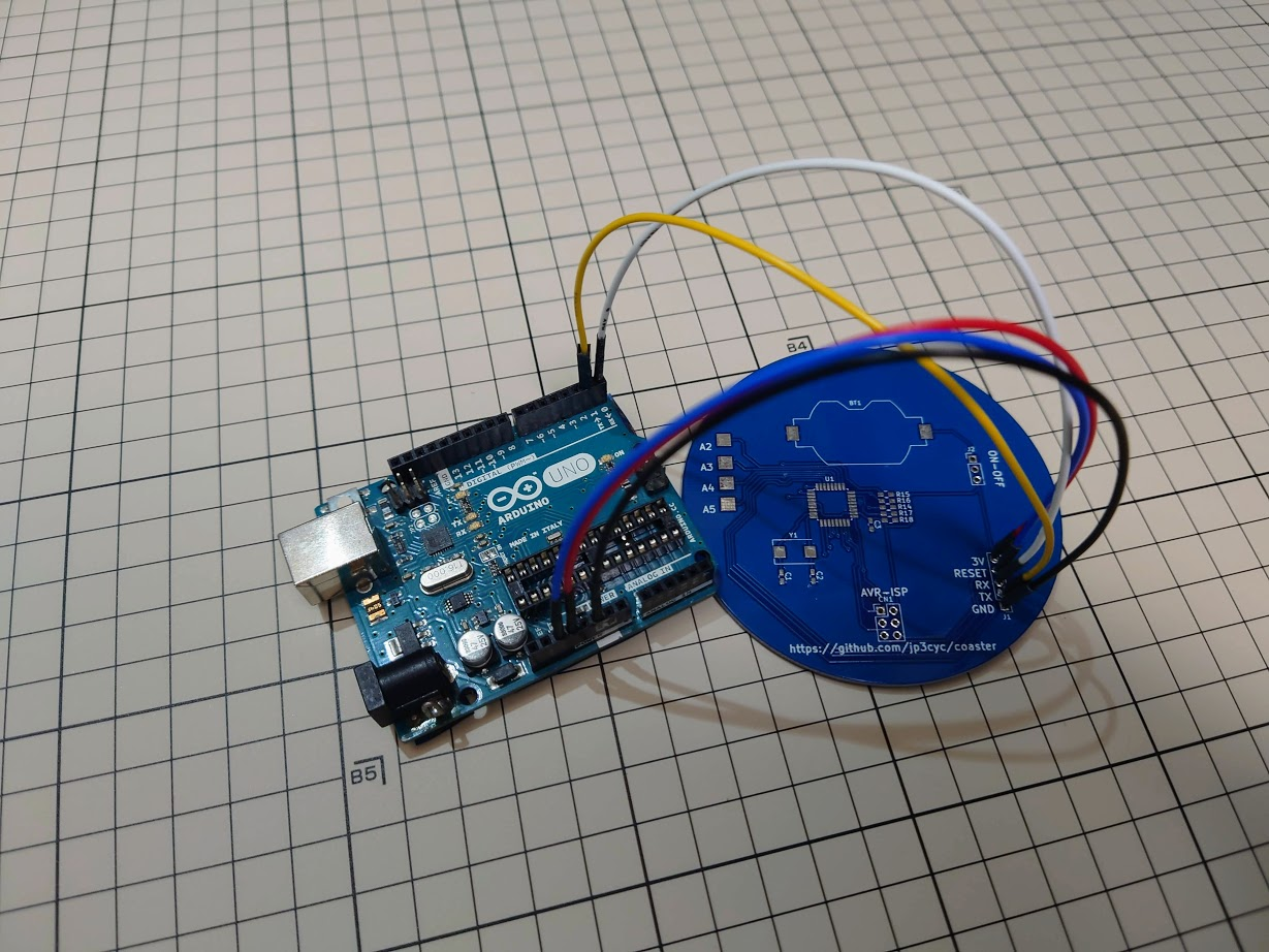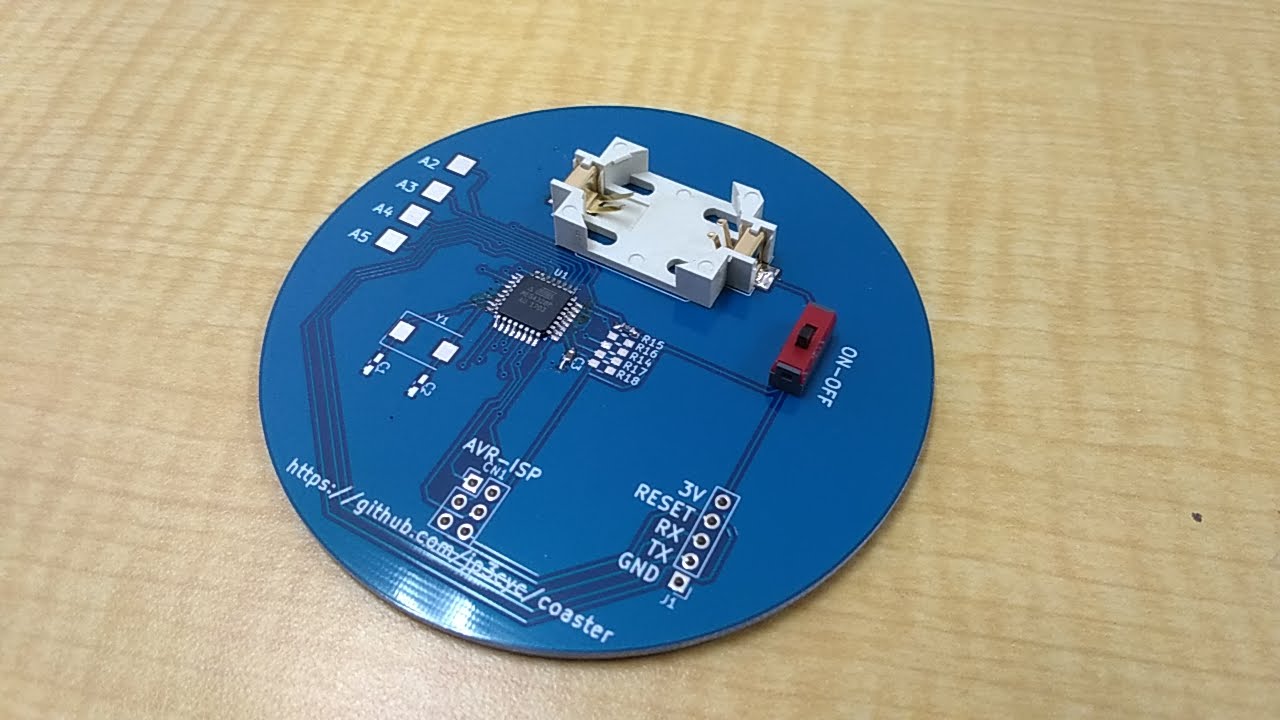 動画のように光るコースターをつくります.Arduino UnoやArduino Pro miniに搭載されているものと同じATMega 328pを利用して,Arduino Pro mini互換ボードとして動作させています.
