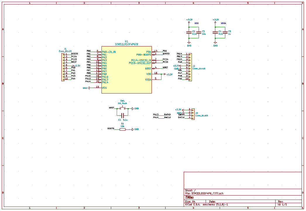STM32L010F4P6を動かすための最低限の周辺回路を、KiCadで作りました。STLinkを使ってSWDで書き込みます。