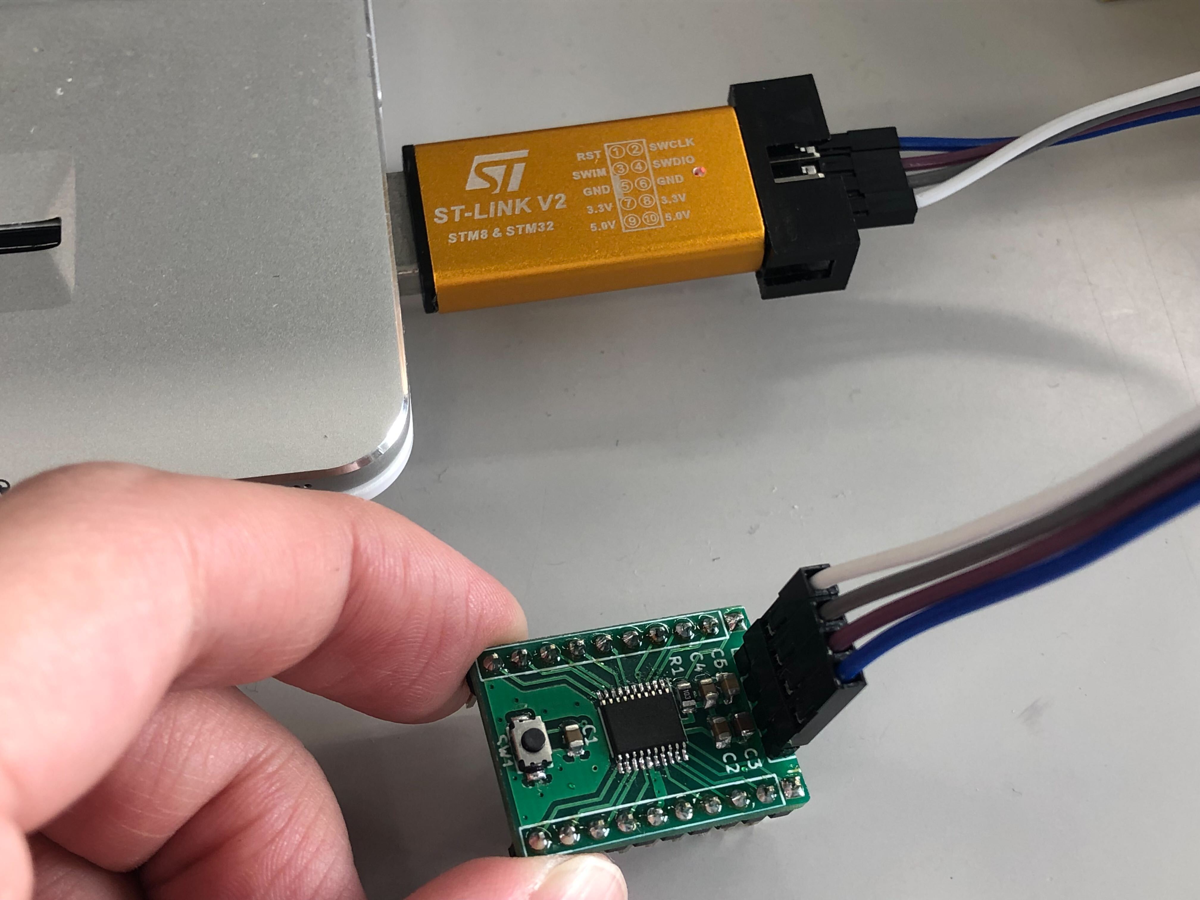 作った基板をSTLink経由でPCに繋げた後、ST-LINK Utilityで接続アイコンを押し、基板のリセットボタンを押します。