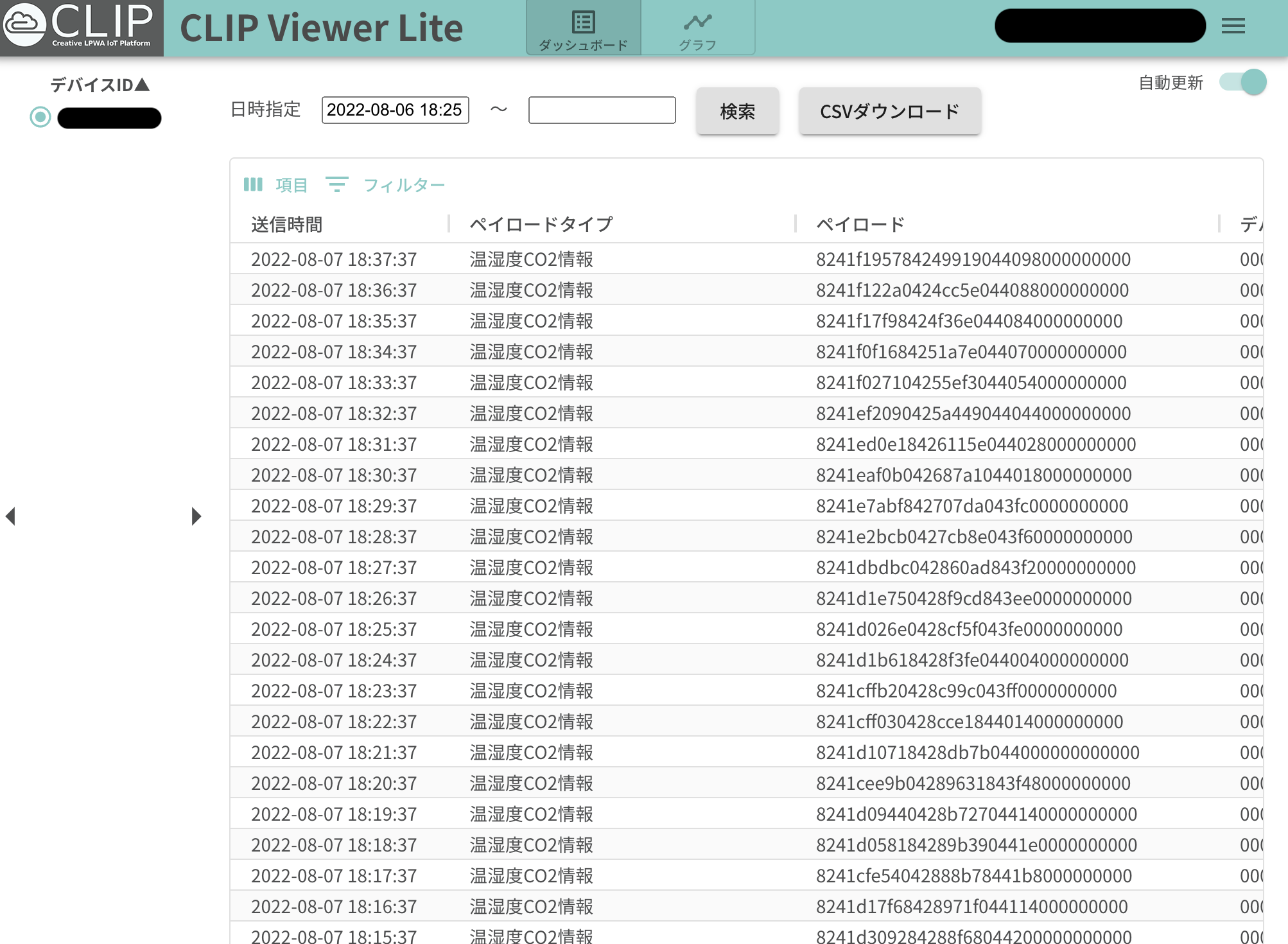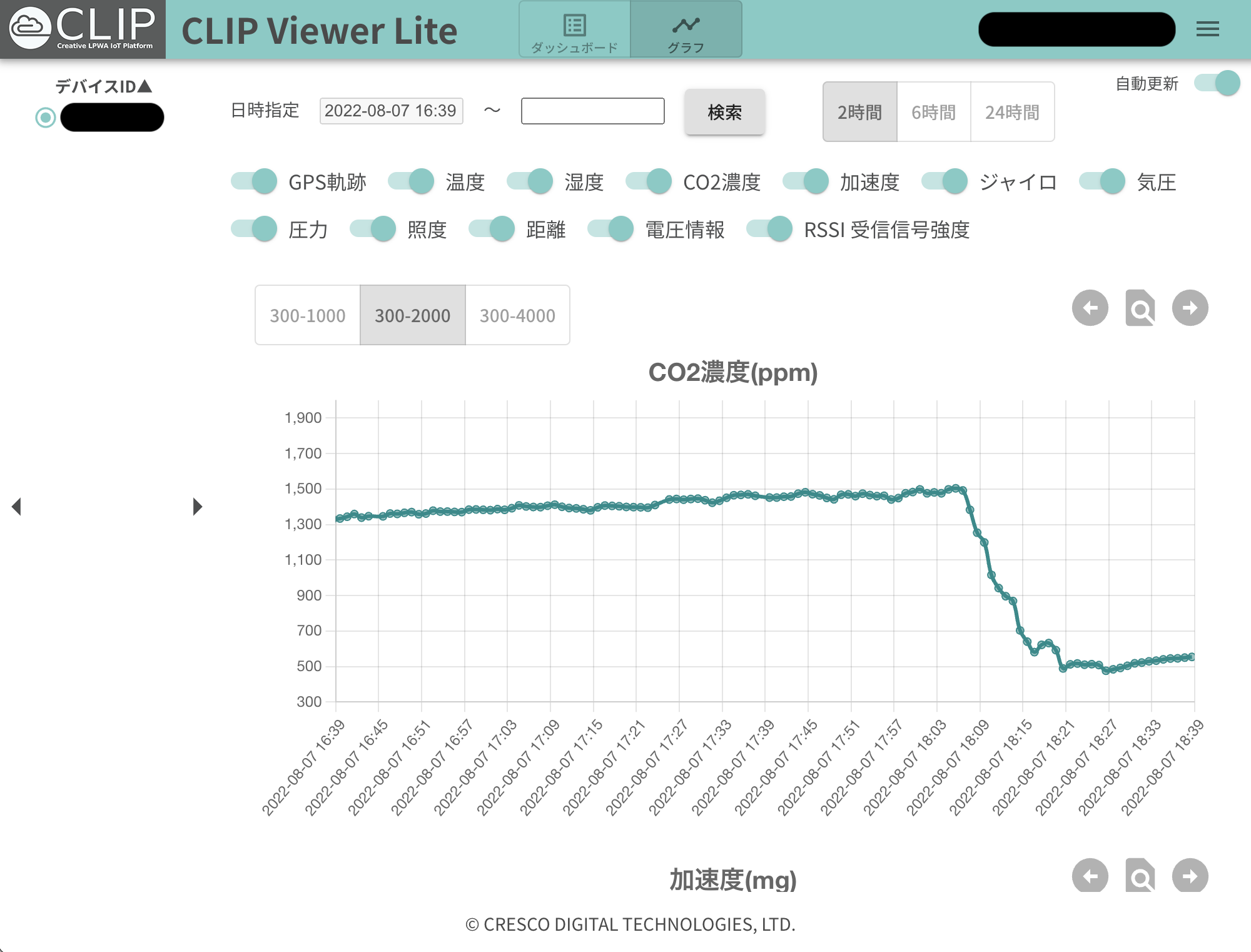 さて、CO2センサから取得した値はELTRES回線を通してクレスコのサーバーへと届けられます。CLIP Viewer Liteを使うと、図のように送信時間やペイロード、受信強度などを確認することができます。また、ペイロードタイプとして温度、湿度、CO2濃度、加速度などが用意されているので指定されたフォーマットでデータを送信してあげると下の図のように自動的にグラフ化して表示してくれます。