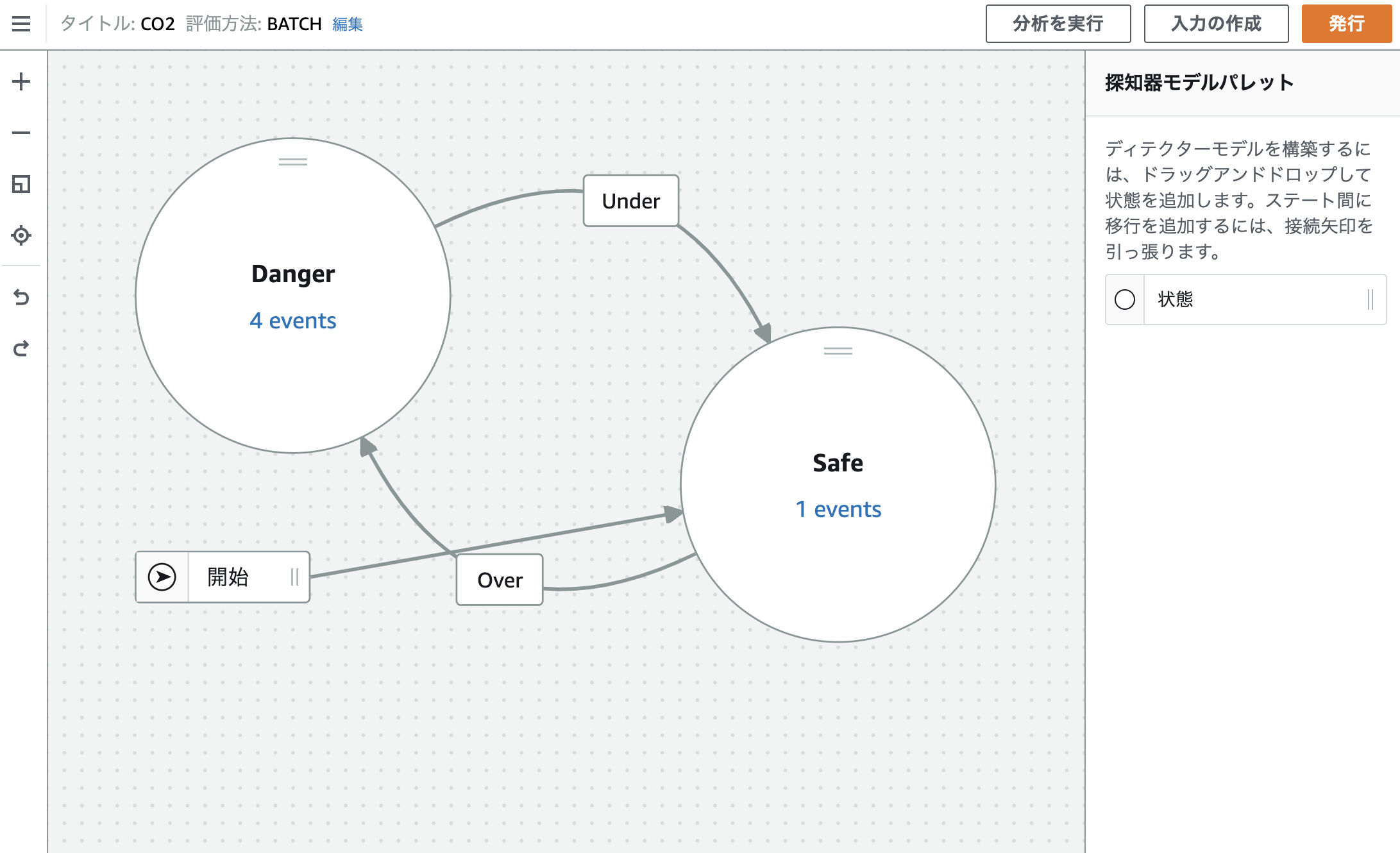 ここでは送られてきたデータが基準値を上回った場合に警告をするために、IoT Eventというサービスを利用します。IoT Eventでは検知器モデルを作成することができ、送られてきたデータに応じてその状態を変化させることで異常な状態など色々なイベントを発行することができるサービスです。Analysisの場合と同様にIoT ruleを指定してあげてあげるとデータが受け取れるようになるので、入力値に応じて基準値を超えているかどうかを判定するために検知器モデルを作成します。今回は図のようにSafeとDangerの2つの状態を定義してあげて、1500ppmを基準として状態遷移を定義してあげました。初めはこの基準値を2000ppmぐらいに設定したのですが、CO2の可視化システムも開発しているクレスコの方に伺ったところ換気の目安としては1500ppm程度が適切だと伺い、最終的にこの値を基準としました。