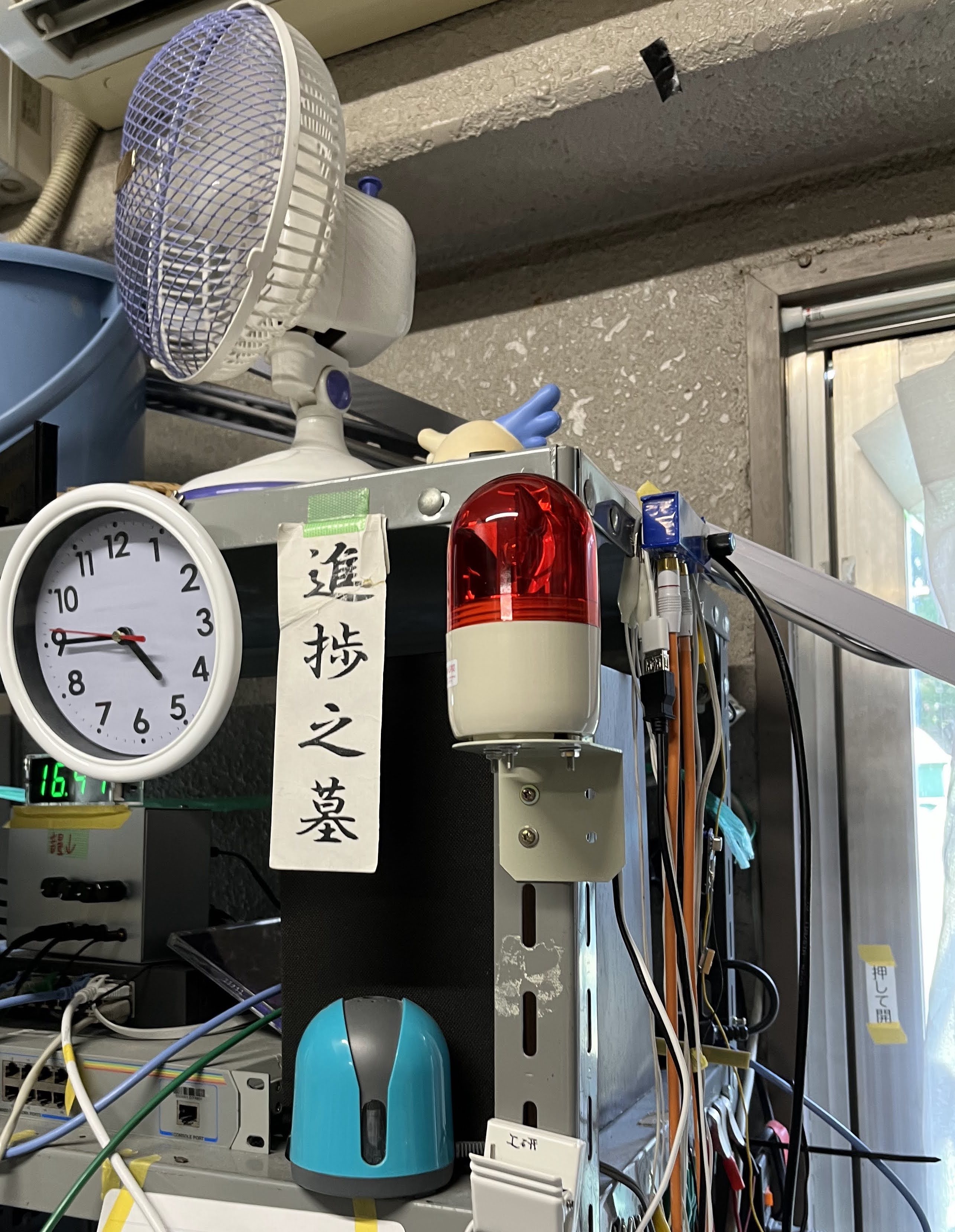 セットアップが完了してWi-Fiに接続した後は、回転灯を固定してあげてACアダプターの電源やESP32の電源を確保してあげます。回転灯は目がつきやすい部室の棚に図のように設置しました。ESP32などの制御部分は写真では見えませんが、棚の上の部分にボックスにまとめて置いてあります。