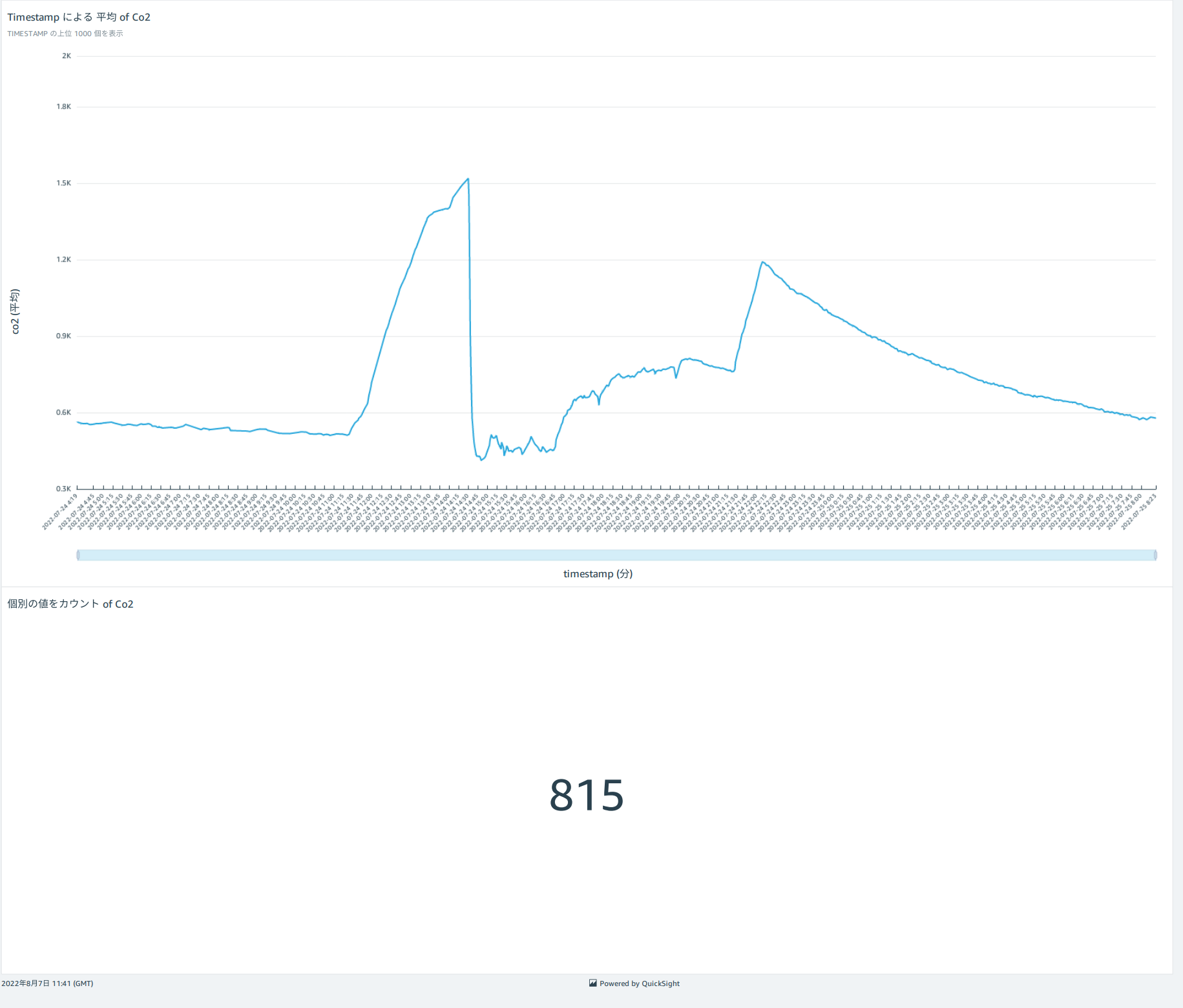 Data Storeに保存されたデータから、一定時間ごとの平均や統計を算出したり分析することができるのもIoT Analysisの機能です。IoT Analysis上でSQLライクな形でデータセットを作成することができ、そのデータがDatasetとして保存されます。そして、Amazon QuickSightを利用することによってデータセットを可視化することができます。Amazon QuickSightはIoT Analysis以外にもさまざまなデータを可視化できるサービスですが、無料枠だと利用できる機能が少し限られてくるのは少し残念なポイントです。実際に可視化したデータは図\ref{fig:quick}のような形で、データセットを元にしてグラフを作成したり、平均値を表示したりなどダッシュボードを自由にカスタマイズして表示させることができます。また、期間を絞ったりフィルターをかけたりすることも簡単にできるので、データ分析をするには便利なツールですね(料金が高いのを除けば)。