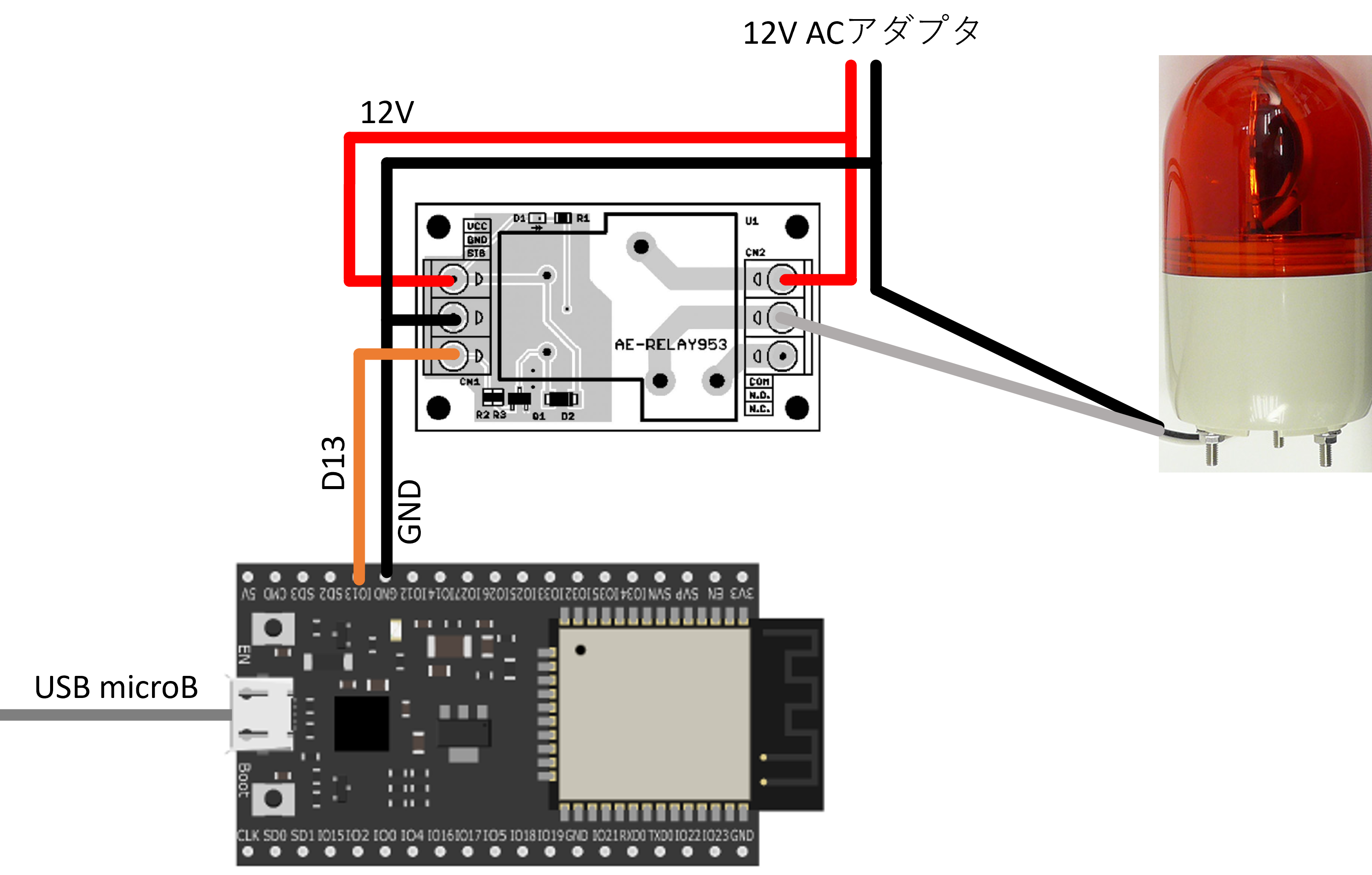 回転灯の電圧が12Vで突入電流が4Aぐらいなのでどうしてもそれに対応するACアダプターとなるとお高めになってしまいます。今回はシンプルに途中にリレーモジュールを挟んであげることでESP32から制御できるようにしました。