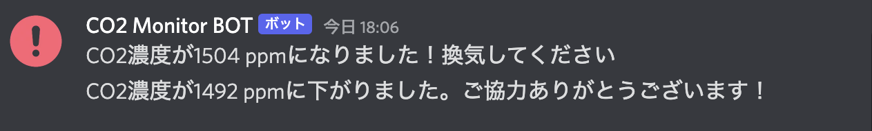 またこのシステムを動かしてから2週間ぐらい経ちますが、アラームが点灯すると定期的に換気するようになったので部室内のCO2濃度も5,000ppmに行くこともなくかなり良い状況へと改善されました。Discordの方も部員の方からの提案で"換気"をすると"歓喜"するBotになり、換気でCO2濃度が下回ったことを確認できるようになったのでより分かりやすくなりました。今後も部室状況をネットで見れるようにするなど色々と改善をしていく予定です。