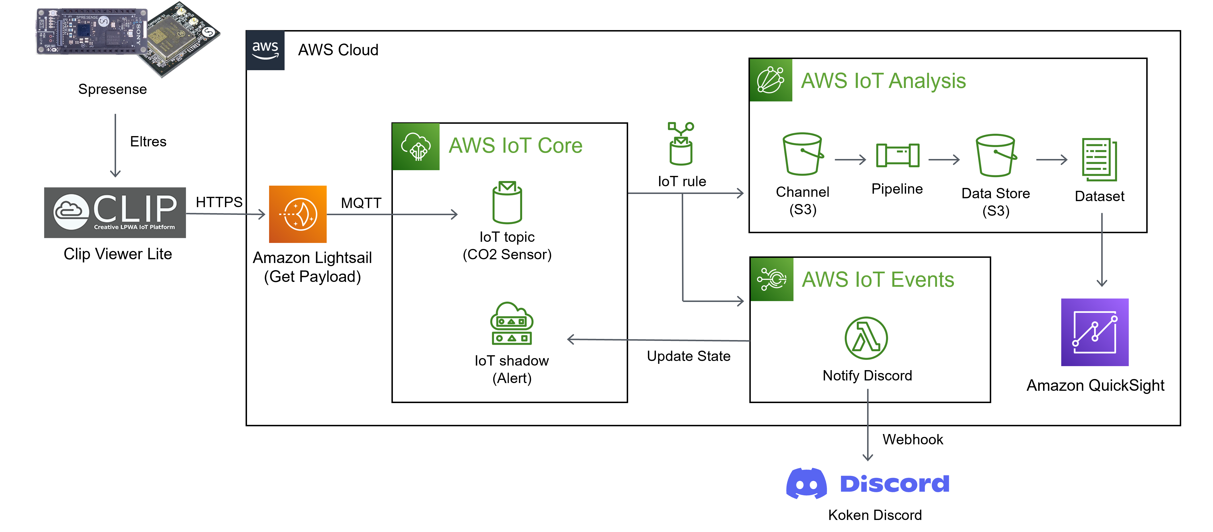 AWS IoT CoreへとCO2データを送信する部分まではできますが、あくまでIoT CoreはデバイスとMQTTで通信をするためのGate Wayに過ぎません。そのため、MQTTで送られてきたデータを保管して表示するためにAWS IoT Analysisという仕組みを利用します。MQTTで取得したデータはIoT CoreでIoT ruleを指定すると別のサービスへ送ることができるため、AWS IoT Analysisへ送信します。AWS IoT Analysisでは受信したデータがChannelに届けられAWS S3(Simple Storage Service)へ生のデータが保存されます。そのデータは、Pipelineを通して無駄なデータを省いた形へ成形された上でData Storeに届きS3で保存されます。